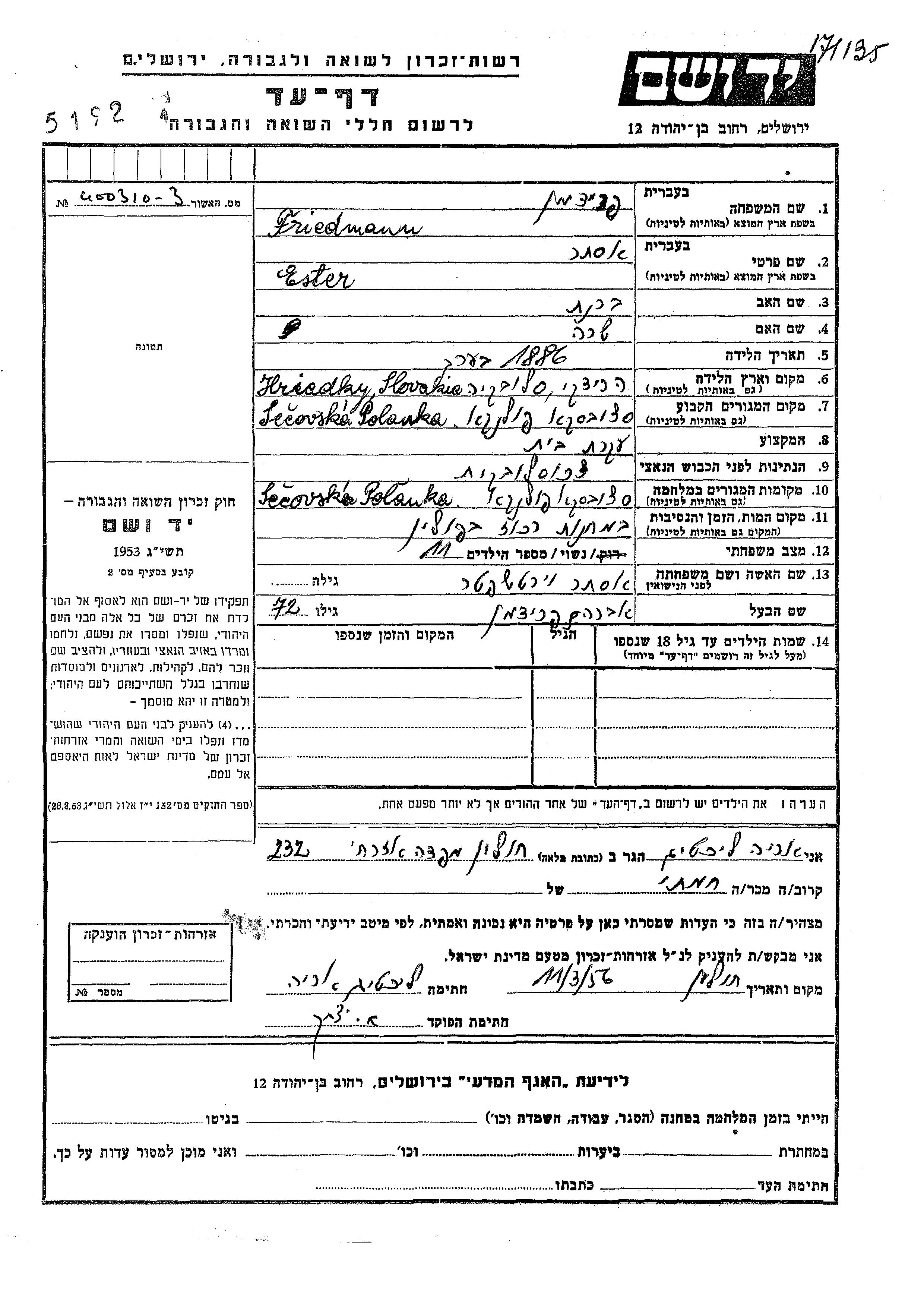 Ester Friedmann, geb. Virtshafter wurde im Jahr 1886 in Hriadki, Tschechoslowakei geboren. Sie war die Tochter von Bernat und Sara. Sie war Hausfrau und mit Avraham Verheiratet. Vor dem Zweiten Weltkrieg lebte sie in Secovska Polanka, Tschechoslowakei. Während des Krieges war sie in Secovska Polanka, Tschechoslowakei.