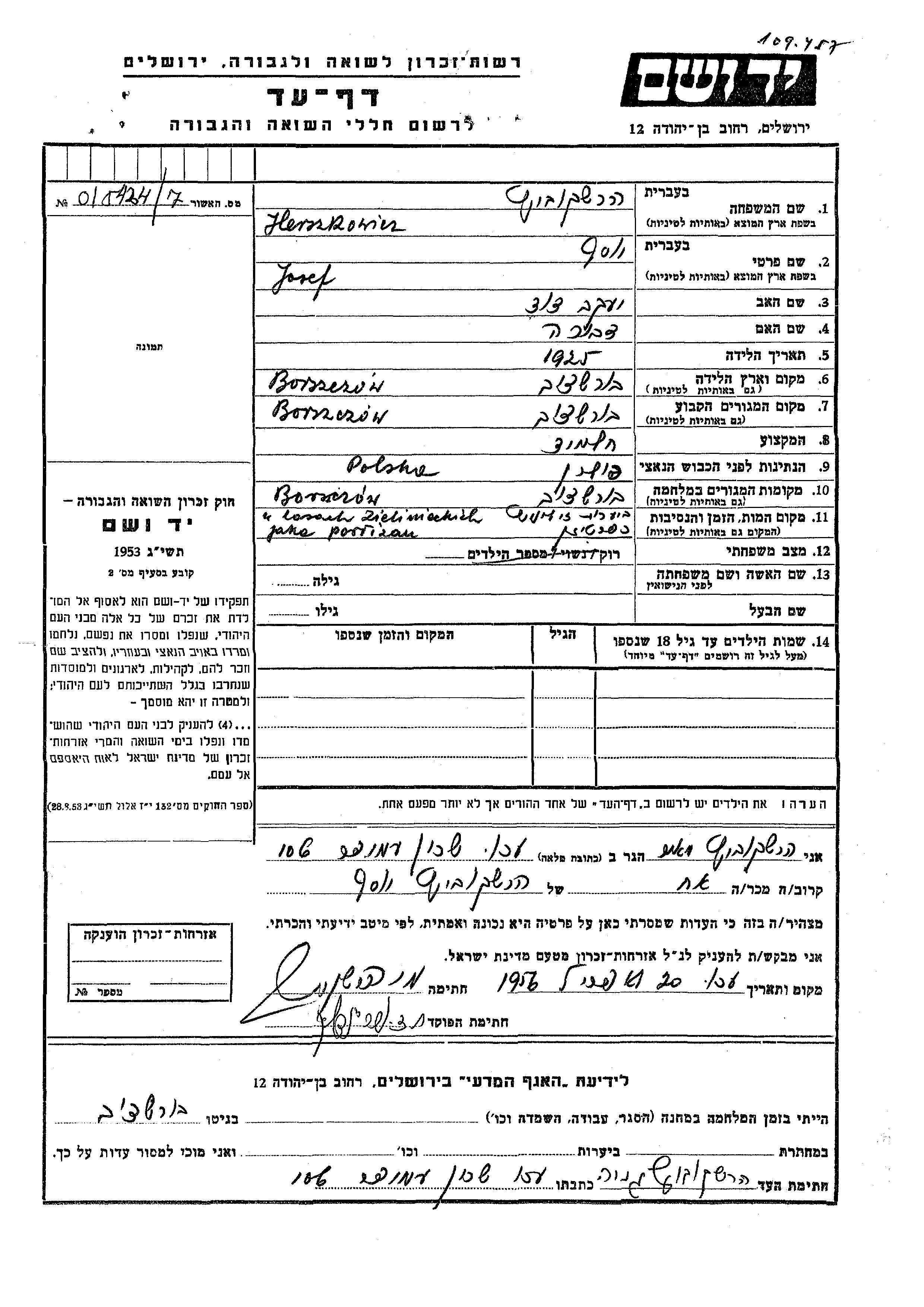 Josef Herszkowicz wurde im Jahr 1925 in Borszczow, Polen geboren. Er war der Sohn von Yaakov David und Dvora. Er war Schüler/-in und Ledig. Vor dem Zweiten Weltkrieg lebte er in Borszczow, Polen. Während des Krieges war er in Borszczow, Polen.