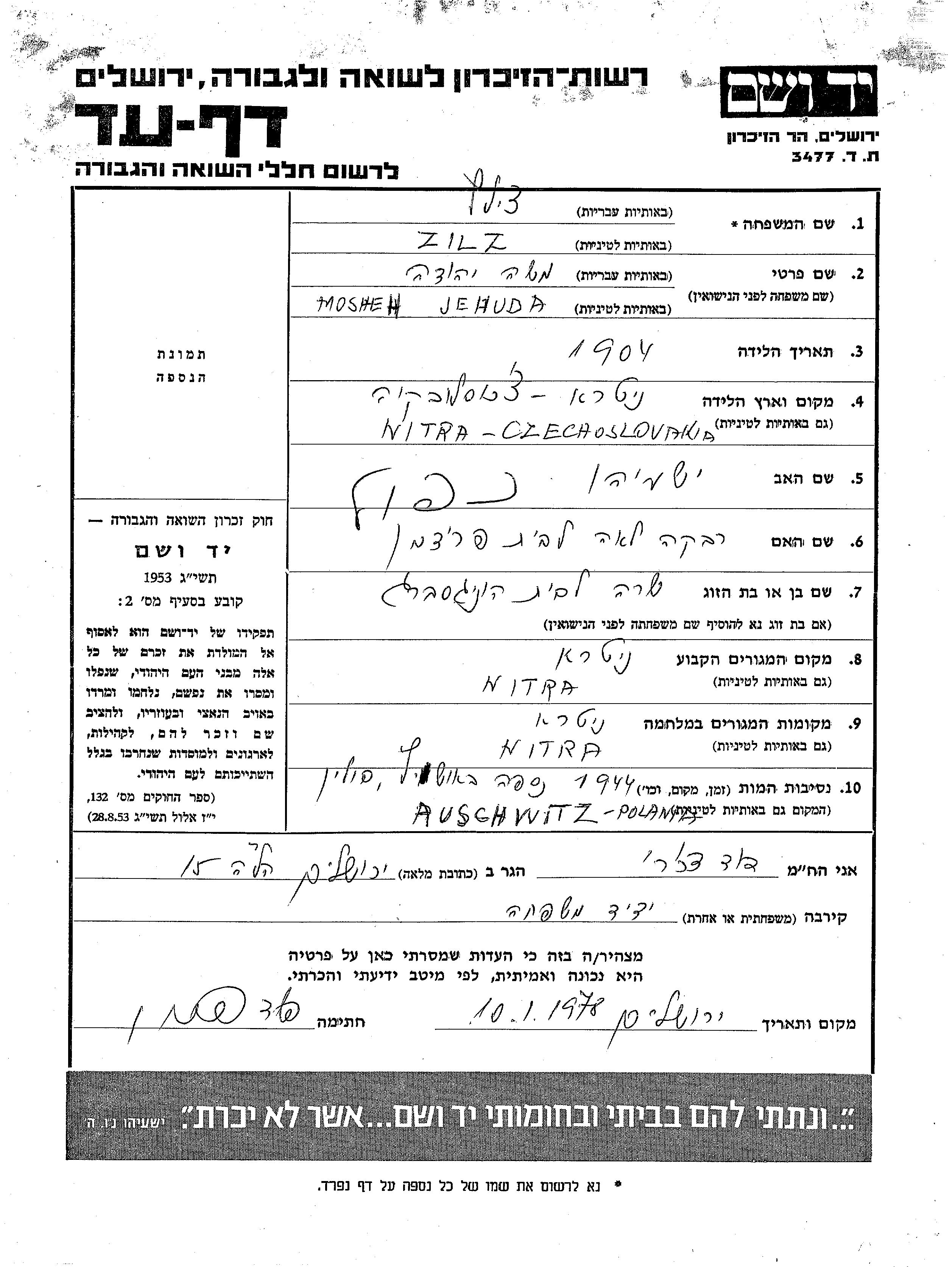 Mosheh Jehuda Zilz wurde im Jahr 1904 in Nitra, Tschechoslowakei geboren. Er war der Sohn von Yeshayahu und Rivka Lea. Er war mit Sara, geb. Honigsberg Verheiratet. Vor dem Zweiten Weltkrieg lebte er in Nitra, Tschechoslowakei. Während des Krieges war er in Nitra, Tschechoslowakei.