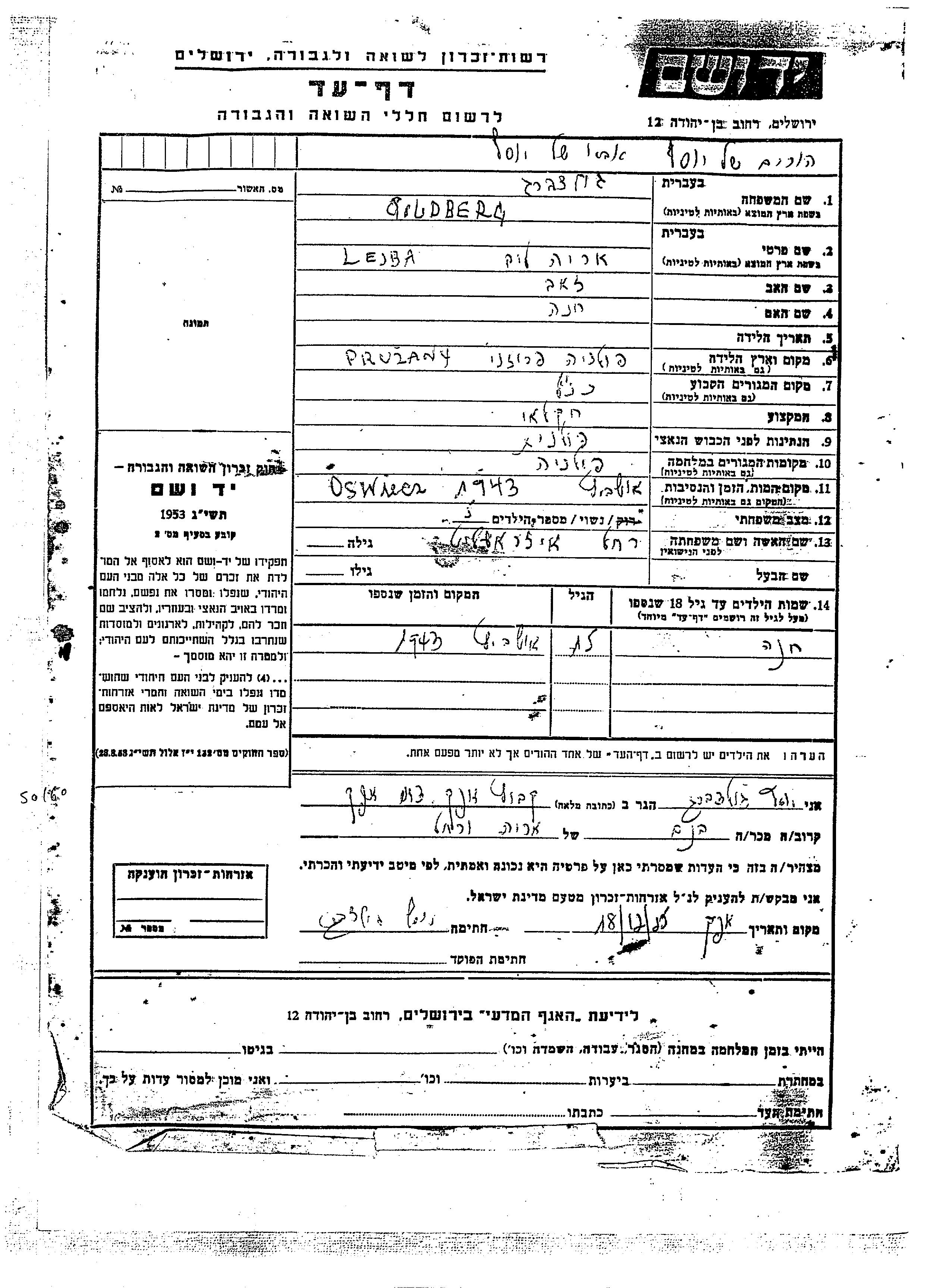 Goldberg Khana Pruzana, Polen Gedenkblatt