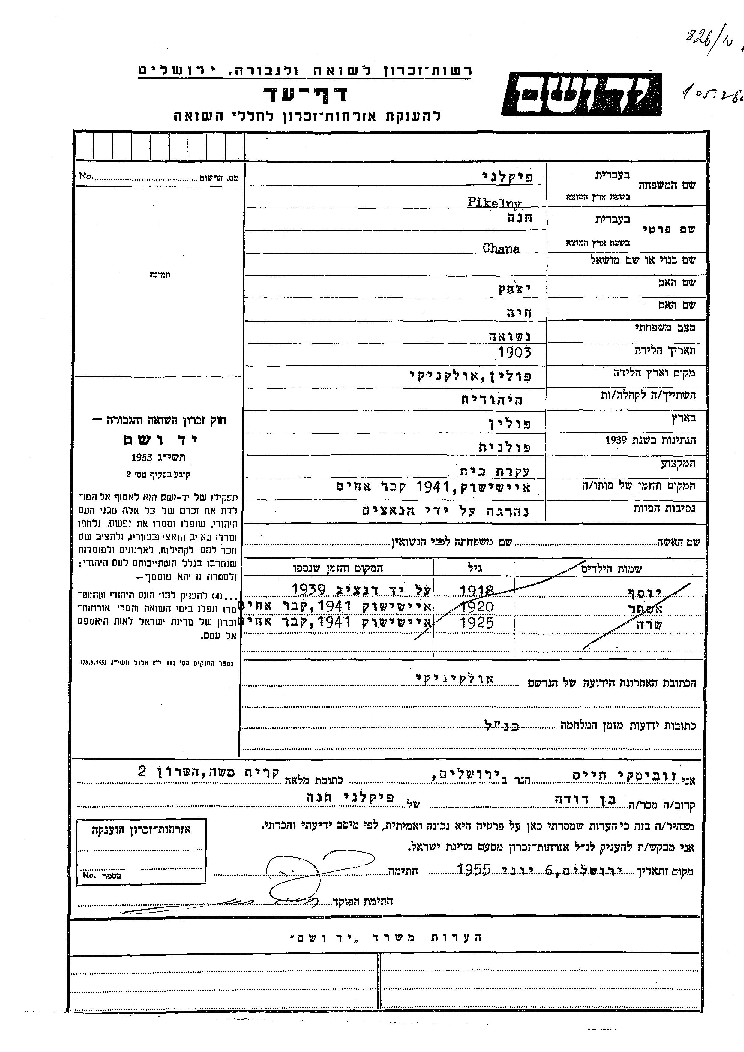 Ester Pikelny wurde im Jahr 1920 geboren. Sie war die Tochter von Chana. Vor dem Zweiten Weltkrieg lebte sie in Olkeniki, Polen. Während des Krieges war sie in Olkeniki, Polen.