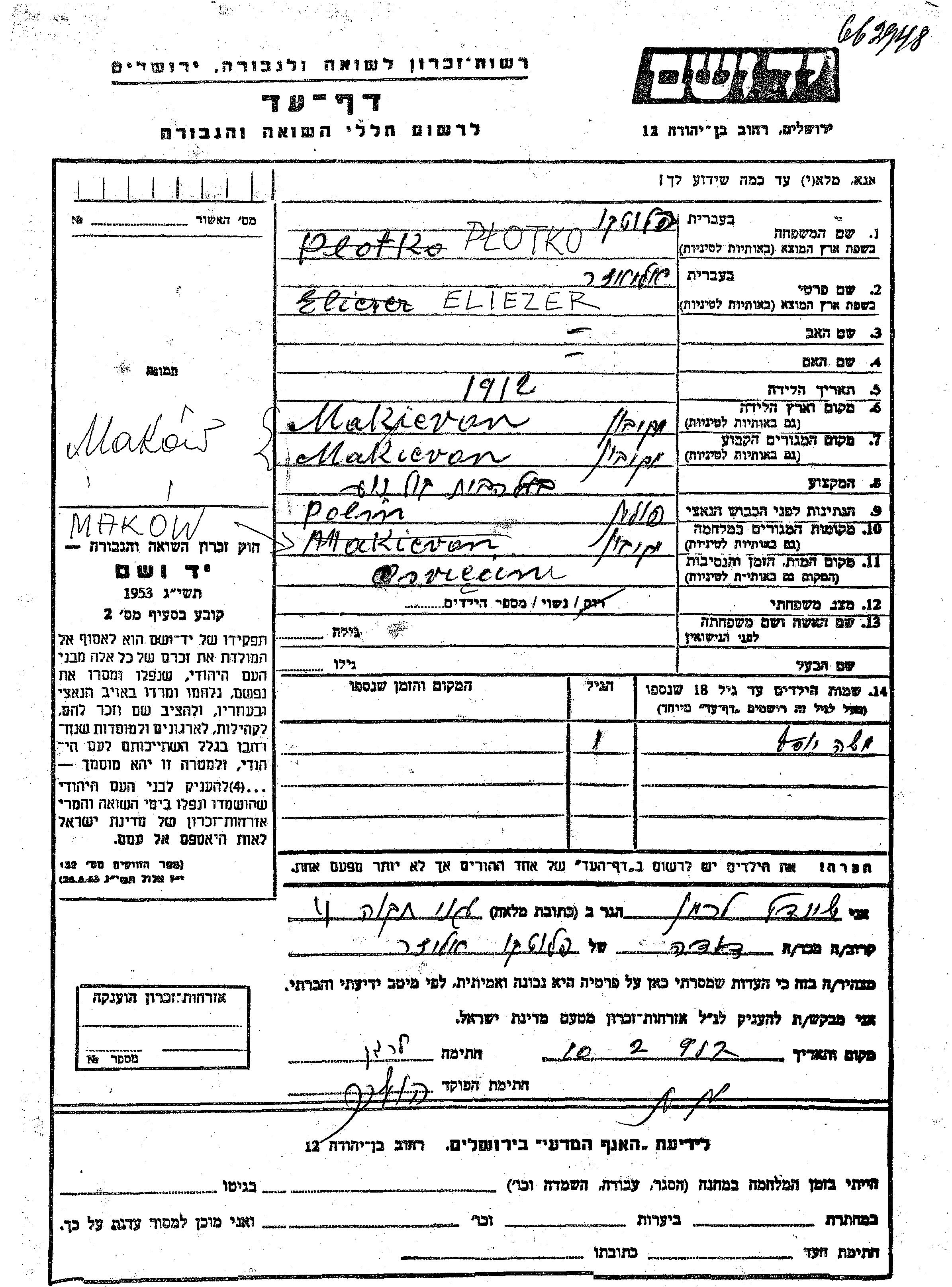 Moshe Yosef Plotko wurde Er war der Sohn von Eliezer. Er war Kind. Vor dem Zweiten Weltkrieg lebte er in Makow, Polen. Während des Krieges war er in Makow, Polen.