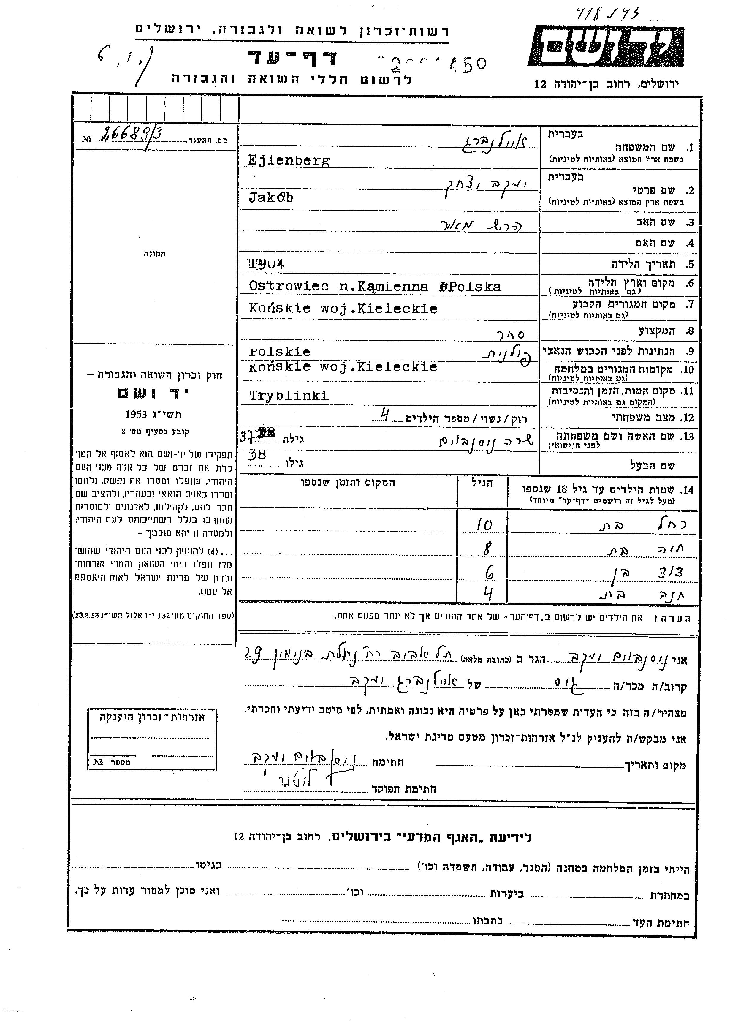 Ejlenberg Khana Konskie, Polen Gedenkblatt