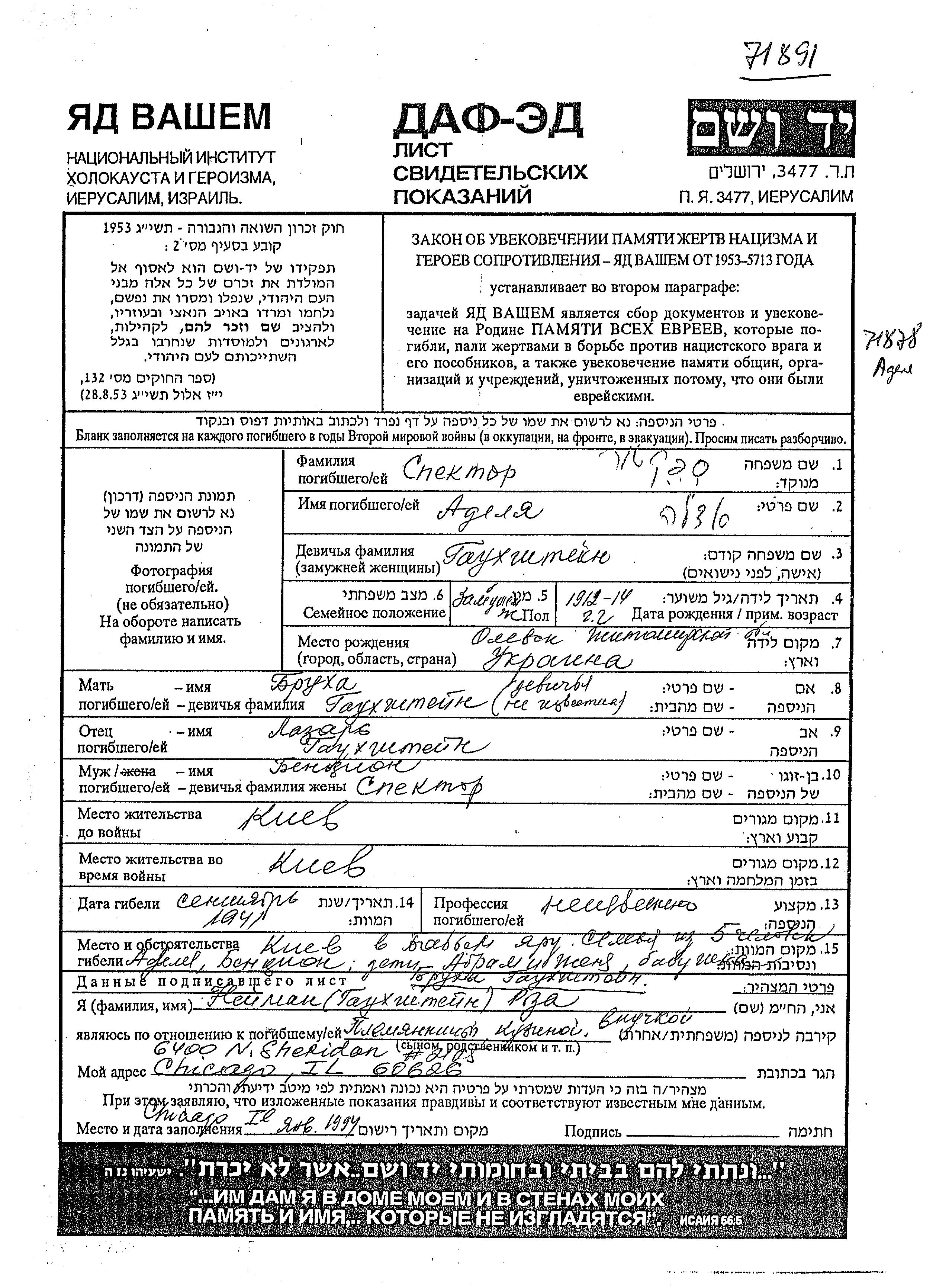 Zhenia Spektor wurde Er/sie war der/ die Sohn/Tochter von Ben Tzion und Adelia, geb. Gaukhshtein. Er/Sie war Kind. Vor dem Zweiten Weltkrieg er/sie in Kiev, Ukraine (UdSSR). Während des Krieges war er/sie in Kiev, Ukraine (UdSSR).