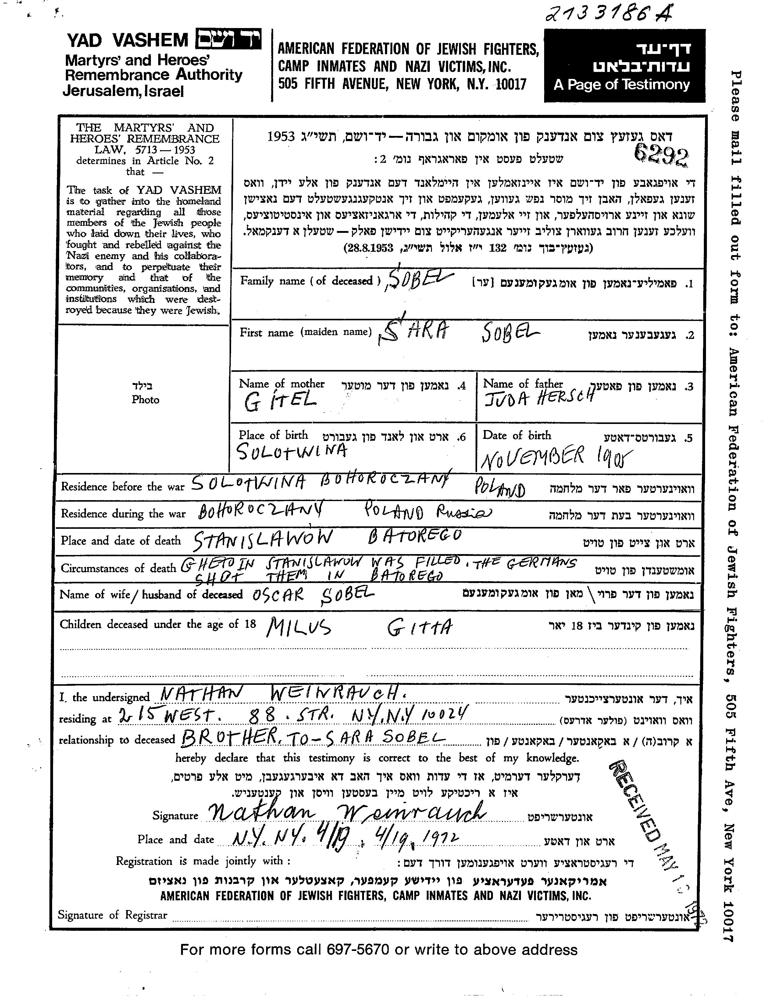 Sobel Gitta Solotwina, Polen Gedenkblatt