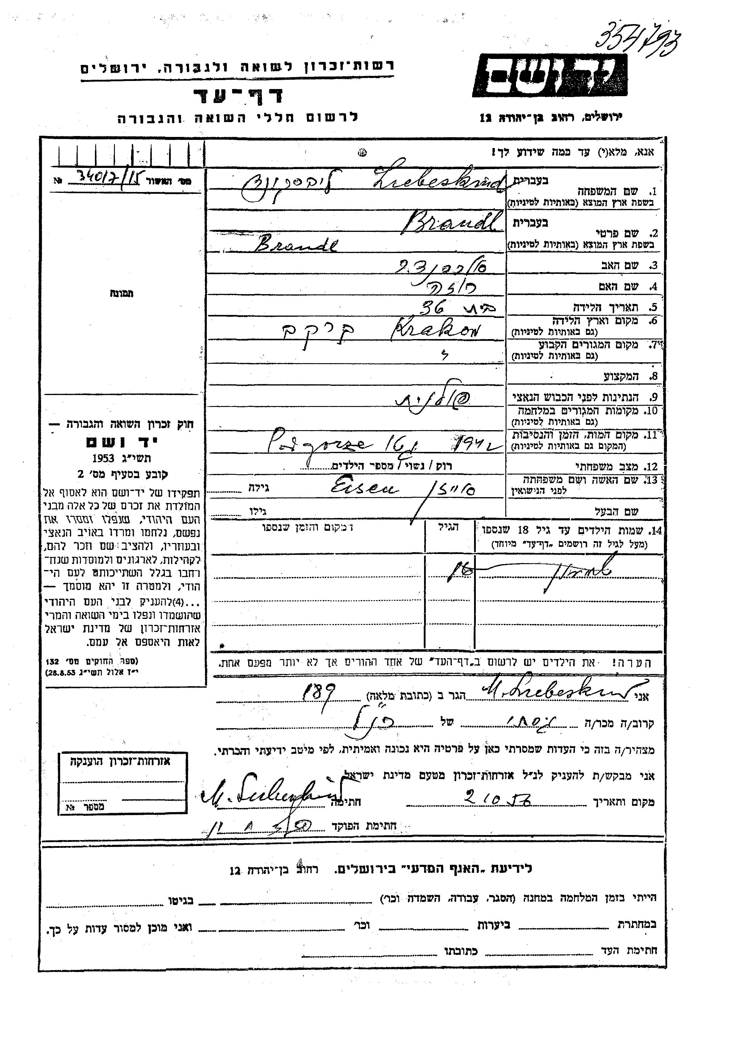Shimon Liebeskind wurde Er war der Sohn von Eisen und Brandl, geb. Eizen. Er war Kind. Vor dem Zweiten Weltkrieg lebte er in Krakow, Polen.