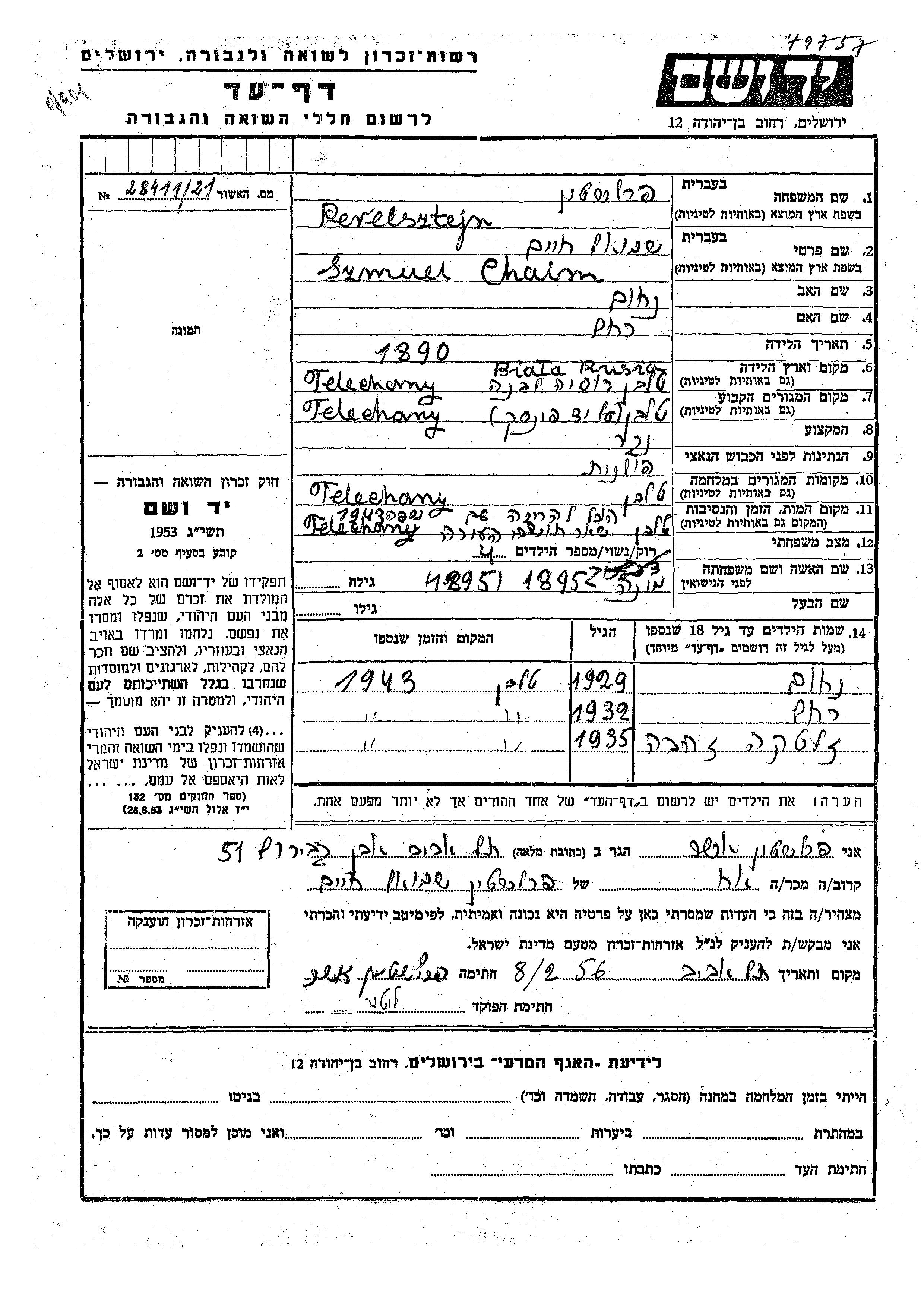 Perelsztejn Zlatka Zahava 1935 Telechany, Polen Gedenkblatt