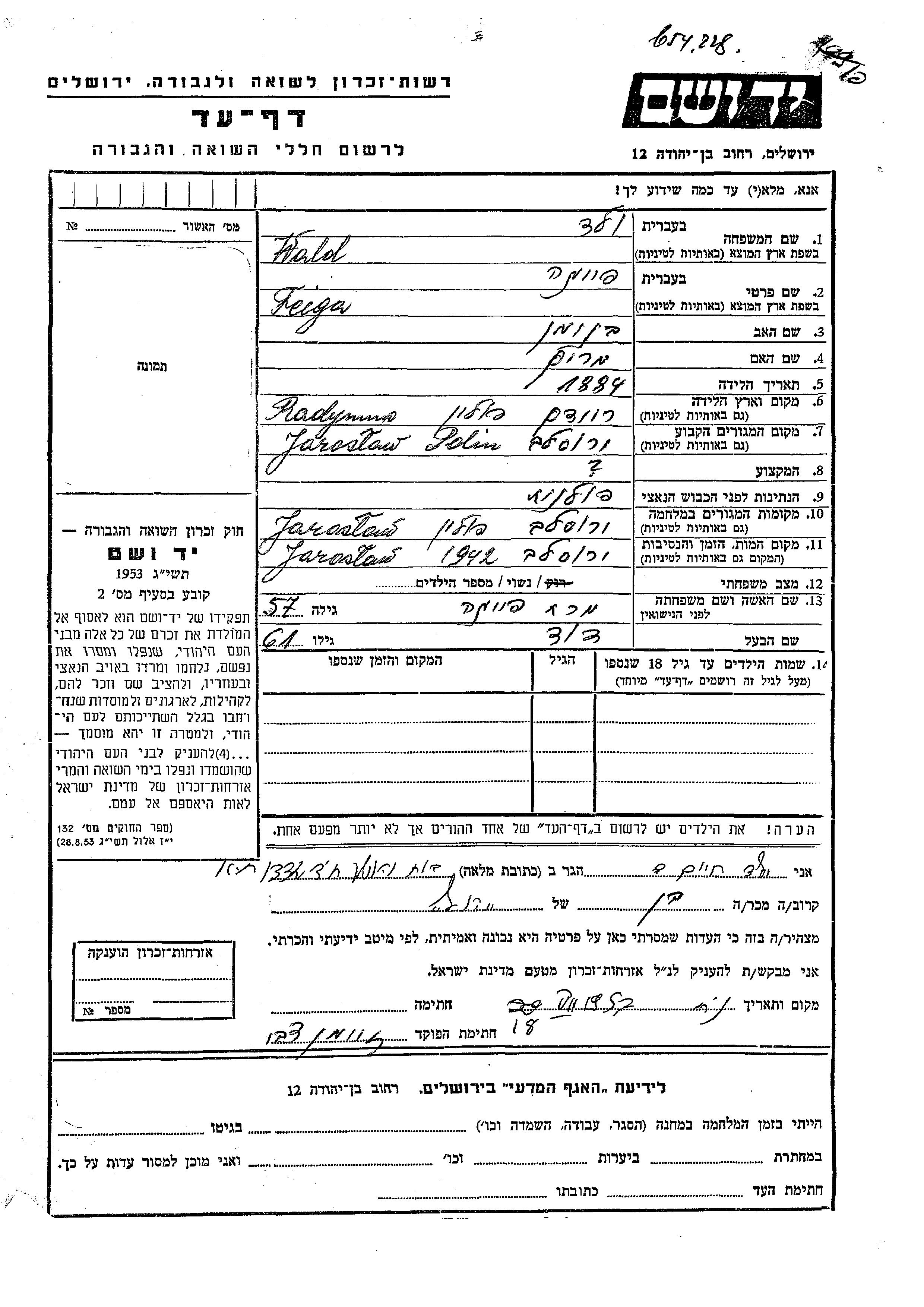 Feiga Wald, geb. Markh wurde im Jahr 1884 in Radymno, Polen geboren. Sie war die Tochter von Beniamin und Miriam. Sie war mit David Verheiratet. Vor dem Zweiten Weltkrieg lebte sie in Jaroslaw, Polen. Während des Krieges war sie in Jaroslaw, Polen.