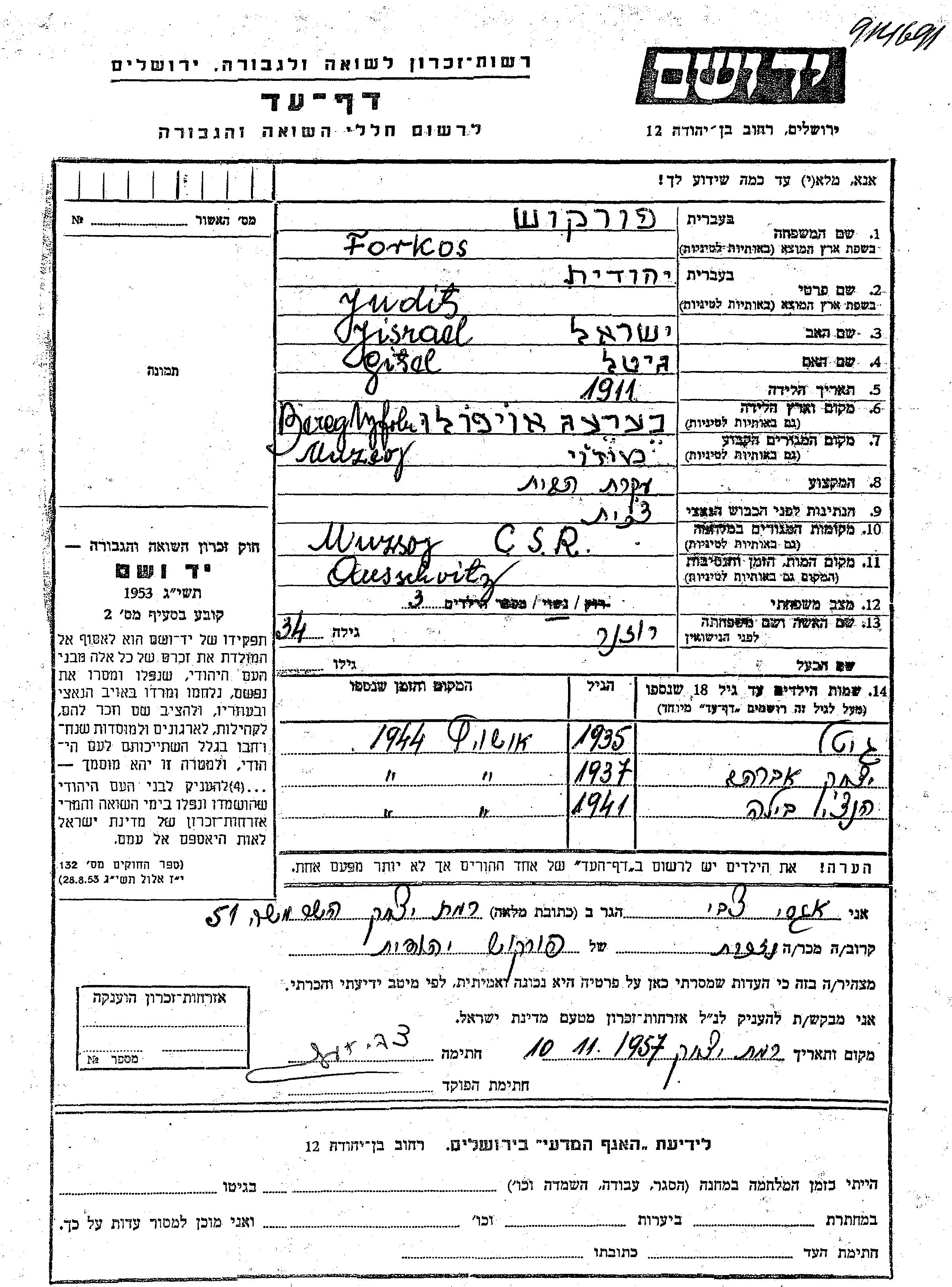 Khana Bila Forkos wurde im Jahr 1941 geboren. Sie war die Tochter von Judit, geb. Rozner. Sie war Kind. Vor dem Zweiten Weltkrieg lebte sie in Muszaj, Ungarn. Während des Krieges war sie in Muszaj, Ungarn.