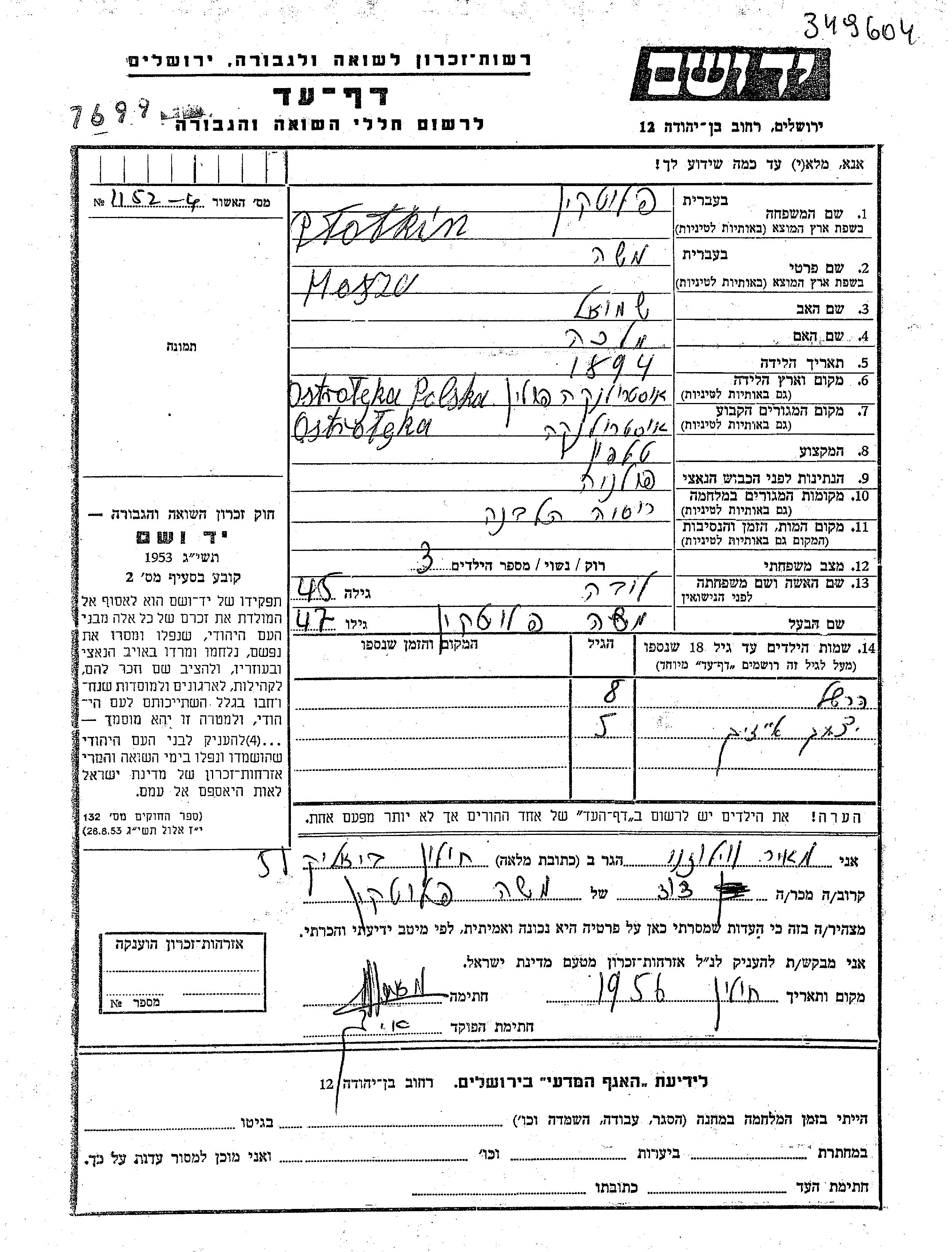 Hershel Plotkin wurde Er war der Sohn von Mosze und Luba. Er war Kind. Vor dem Zweiten Weltkrieg lebte er in Ostroleka, Polen. Während des Krieges war er in Weißrussland (UdSSR).