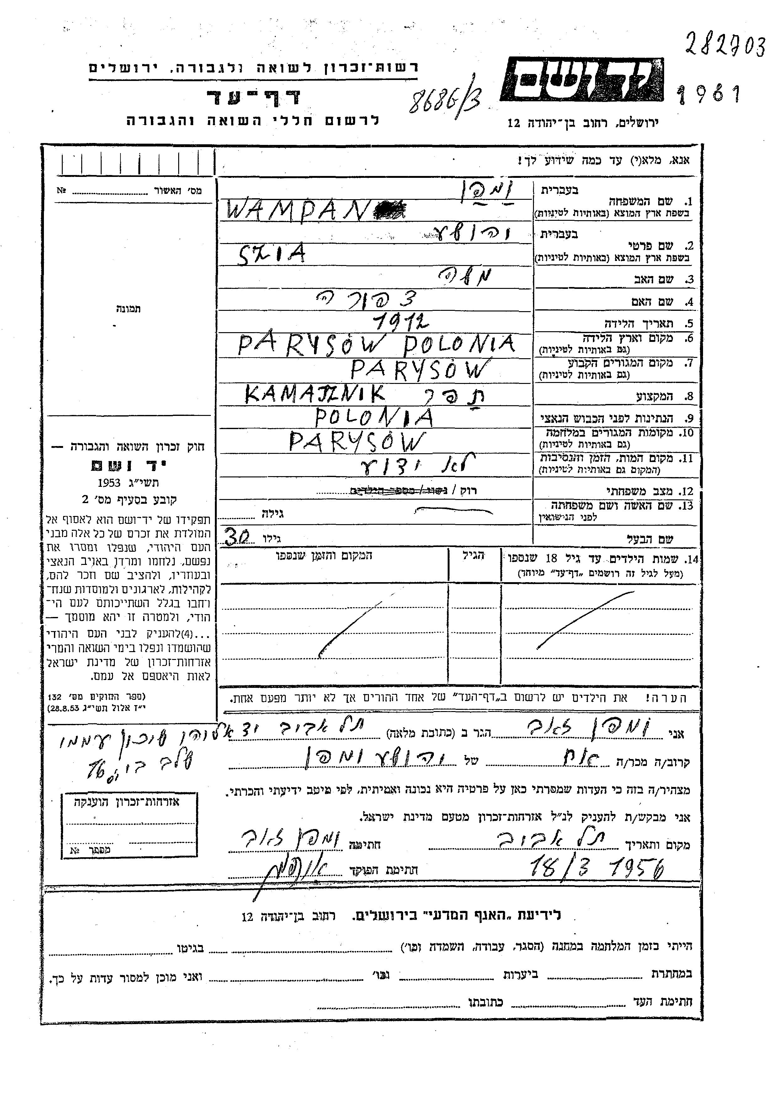 Szia Wampan wurde im Jahr 1912 in Parysow, Polen geboren. Er war der Sohn von Moshe und Tzipora. Er war Näher. Vor dem Zweiten Weltkrieg lebte er in Parysow, Polen. Während des Krieges war er in Parysow, Polen.