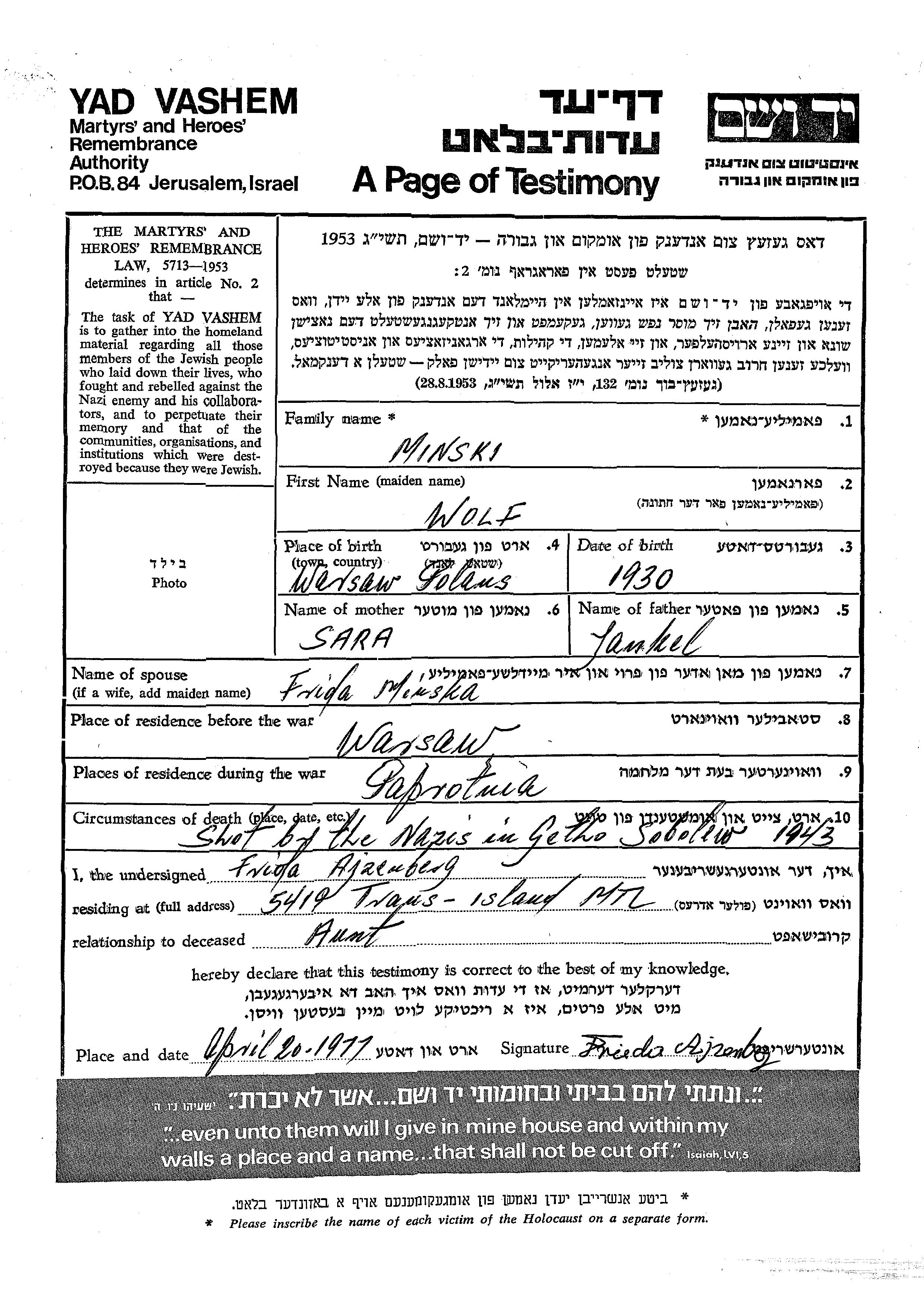 Wolf Minski wurde im Jahr 1930 in Warsaw, Polen geboren. Er war der Sohn von Jankel und Sara. Vor dem Zweiten Weltkrieg lebte er in Warsaw, Polen. Während des Krieges war er in Paprotnia, Polen.