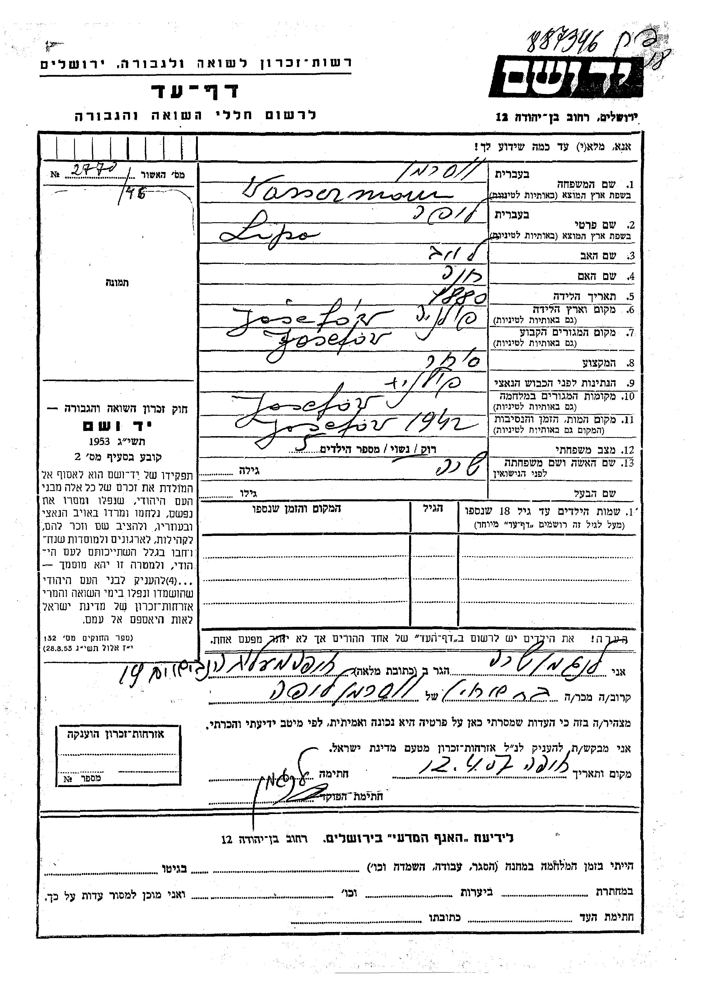 Lipa Wasserman wurde im Jahr 1880 in Josefov geboren. Er war der Sohn von Leib und Khana. Er war Kaufmann/-frau und mit Sara Verheiratet. Vor dem Zweiten Weltkrieg lebte er in Josefov. Während des Krieges war er in Josefov.
