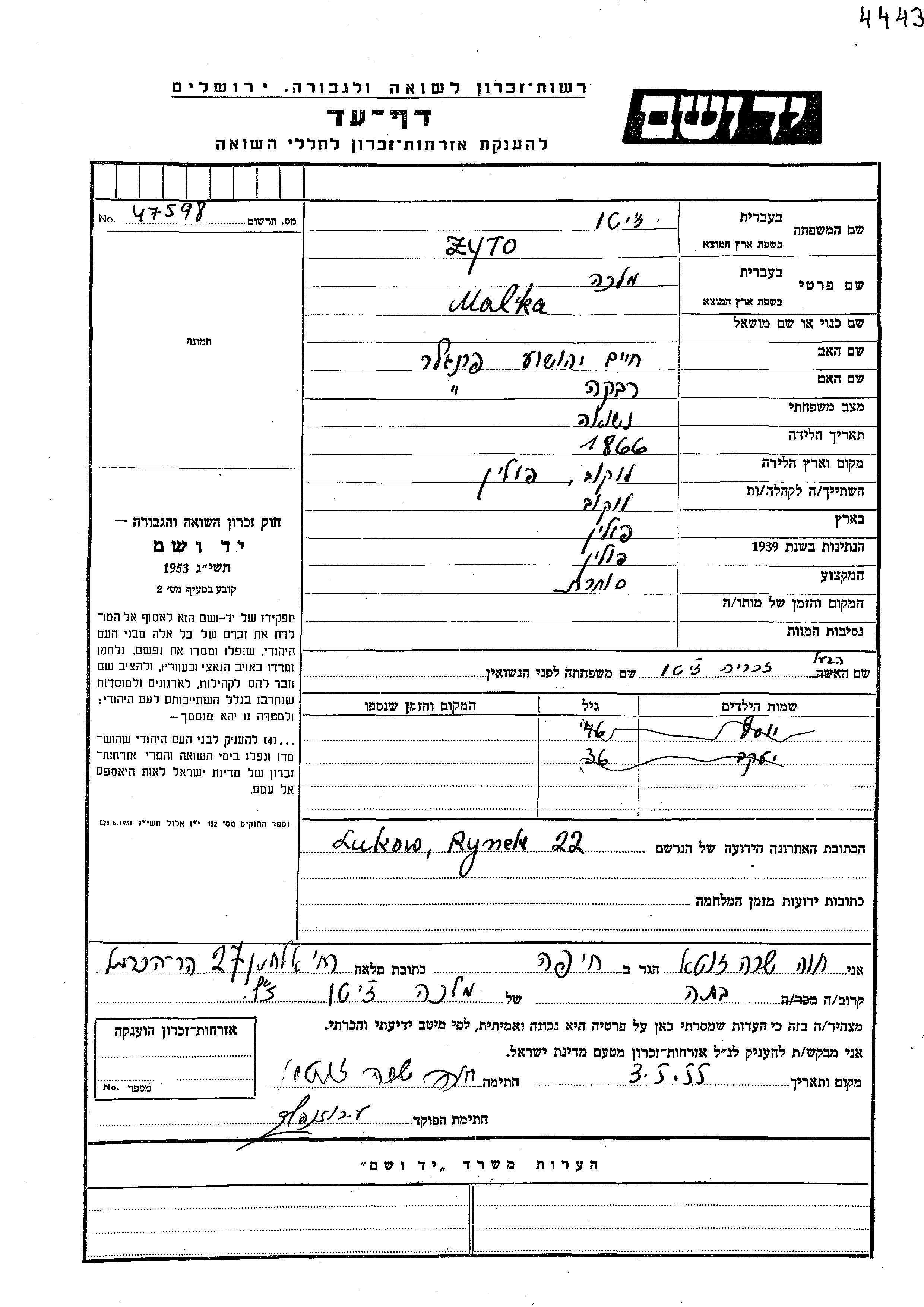 Malka Zyto, geb. Prengler wurde im Jahr 1866 in Lukow, Polen geboren. Sie war die Tochter von Khaim Yehoshua und Rivka. Sie war Kaufmann/-frau und mit Zakharia Verheiratet. Vor dem Zweiten Weltkrieg lebte sie in Lukow, Polen.
