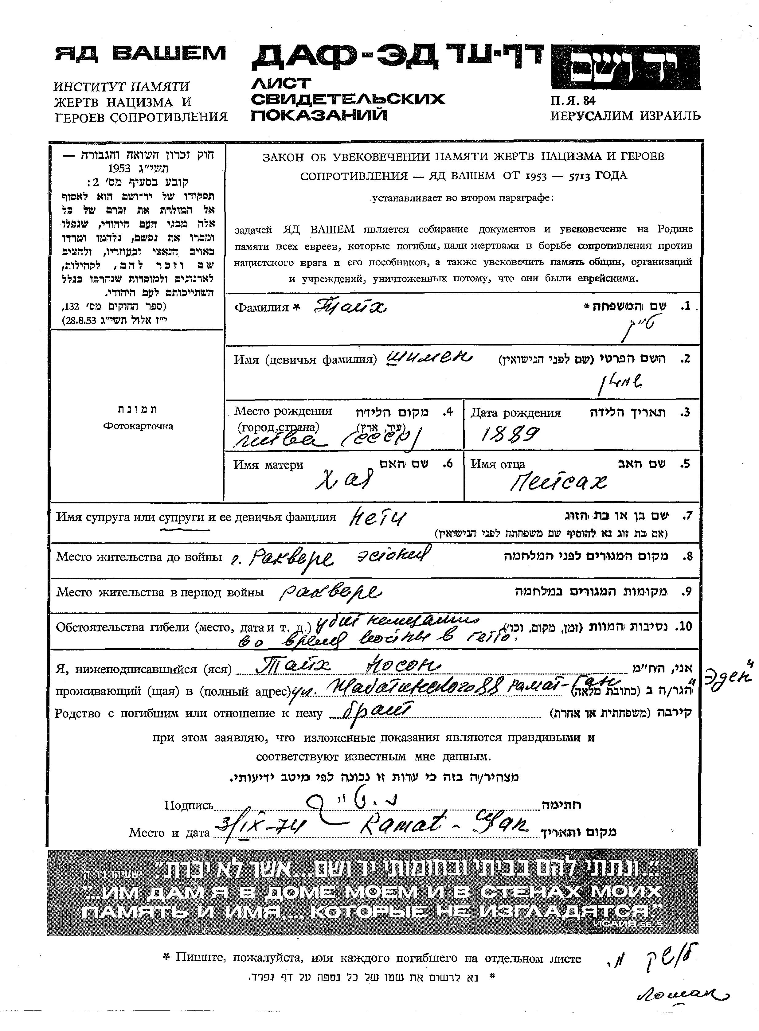 Shimen wurde in der Schoah ermordet. Todesort: Rakvere, Estland.