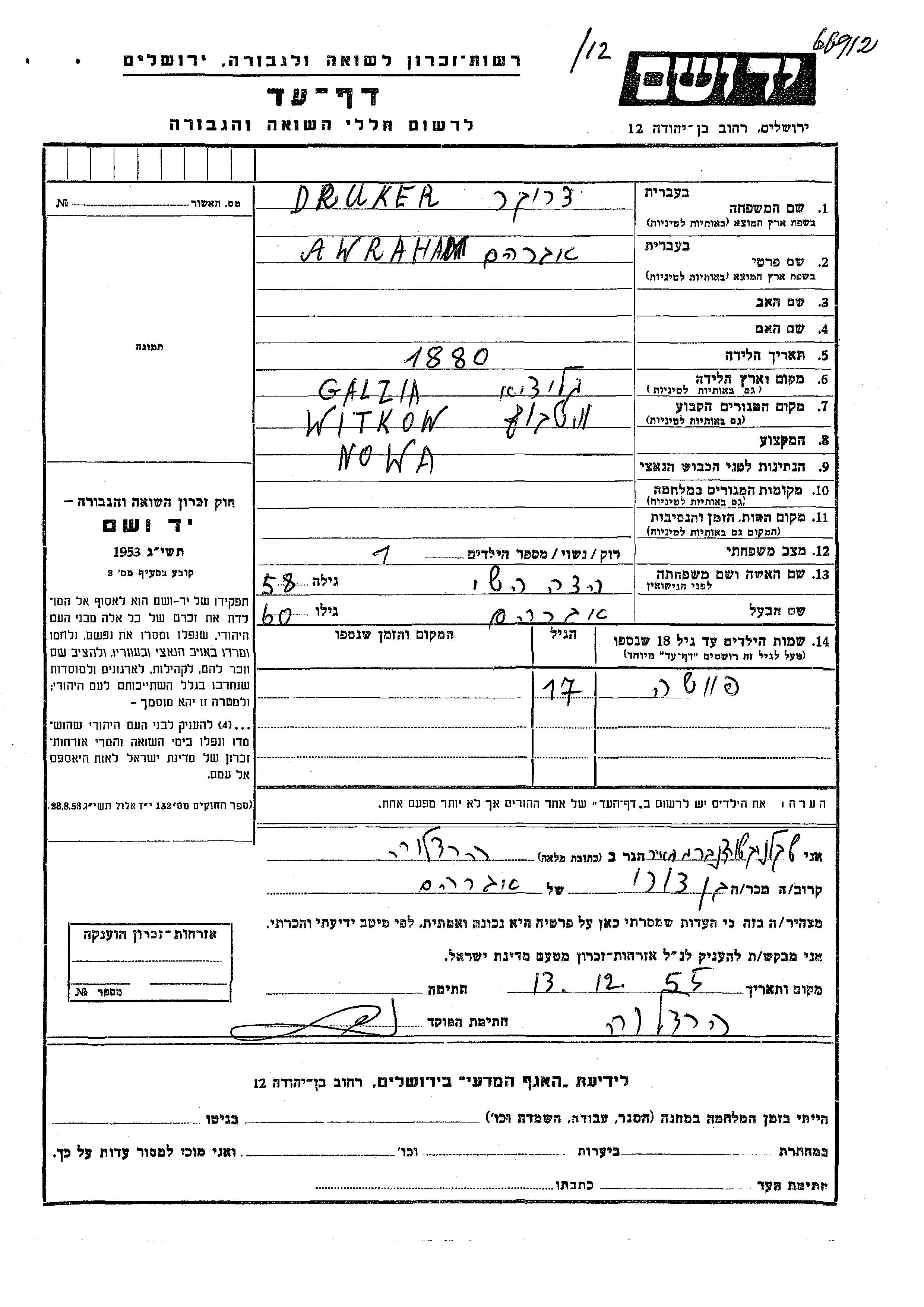 Feibush Druker wurde Er war der Sohn von Awraham und Heda, geb. Hashi. Er war Kind. Vor dem Zweiten Weltkrieg lebte er in Witkow Nowy, Polen.