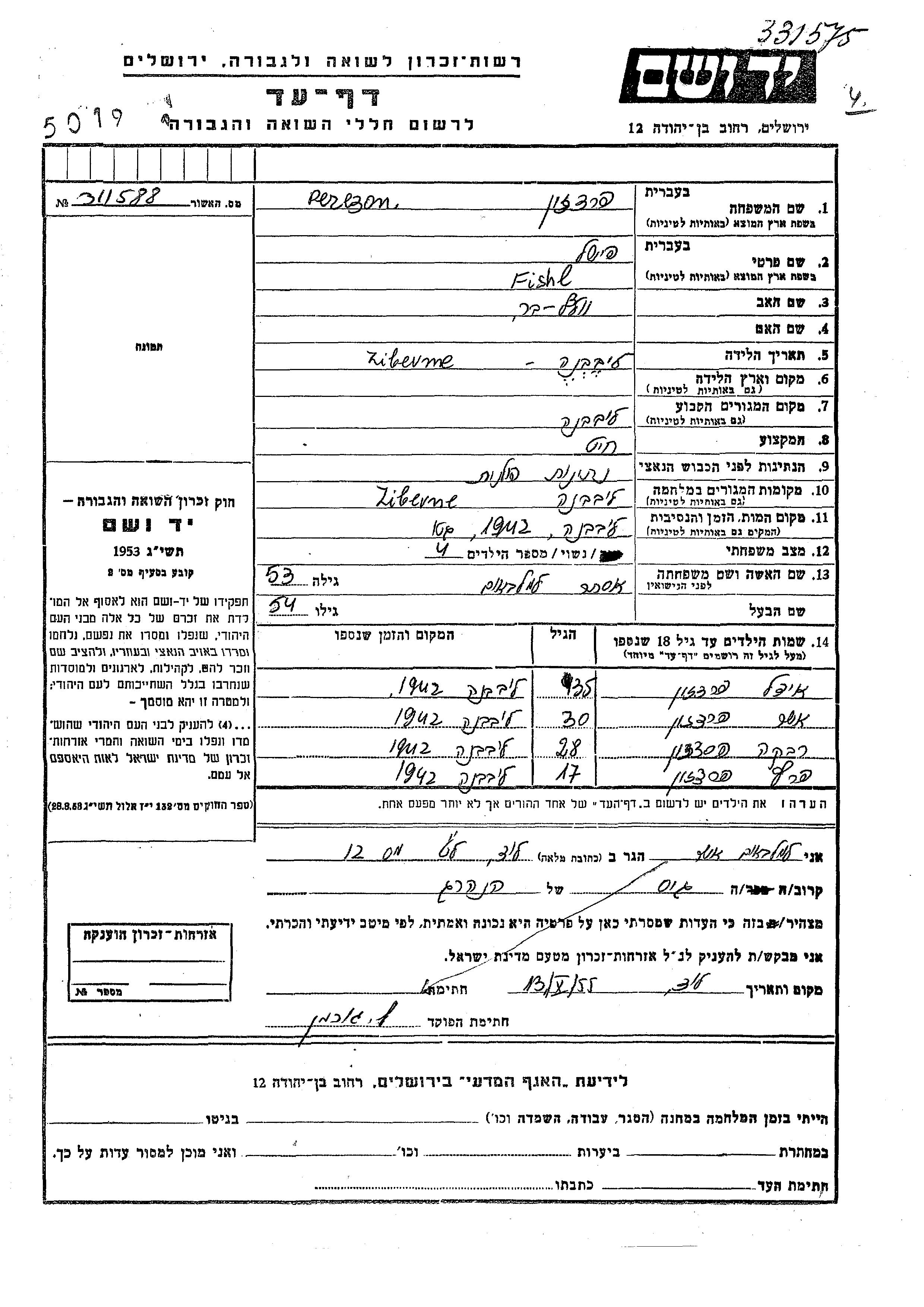 Peretz Perczon wurde Er war der Sohn von Fishl und Ester, geb. Lemelbaum. Er war Kind. Vor dem Zweiten Weltkrieg lebte er in Libevne, Polen. Während des Krieges war er in Libevne, Polen.