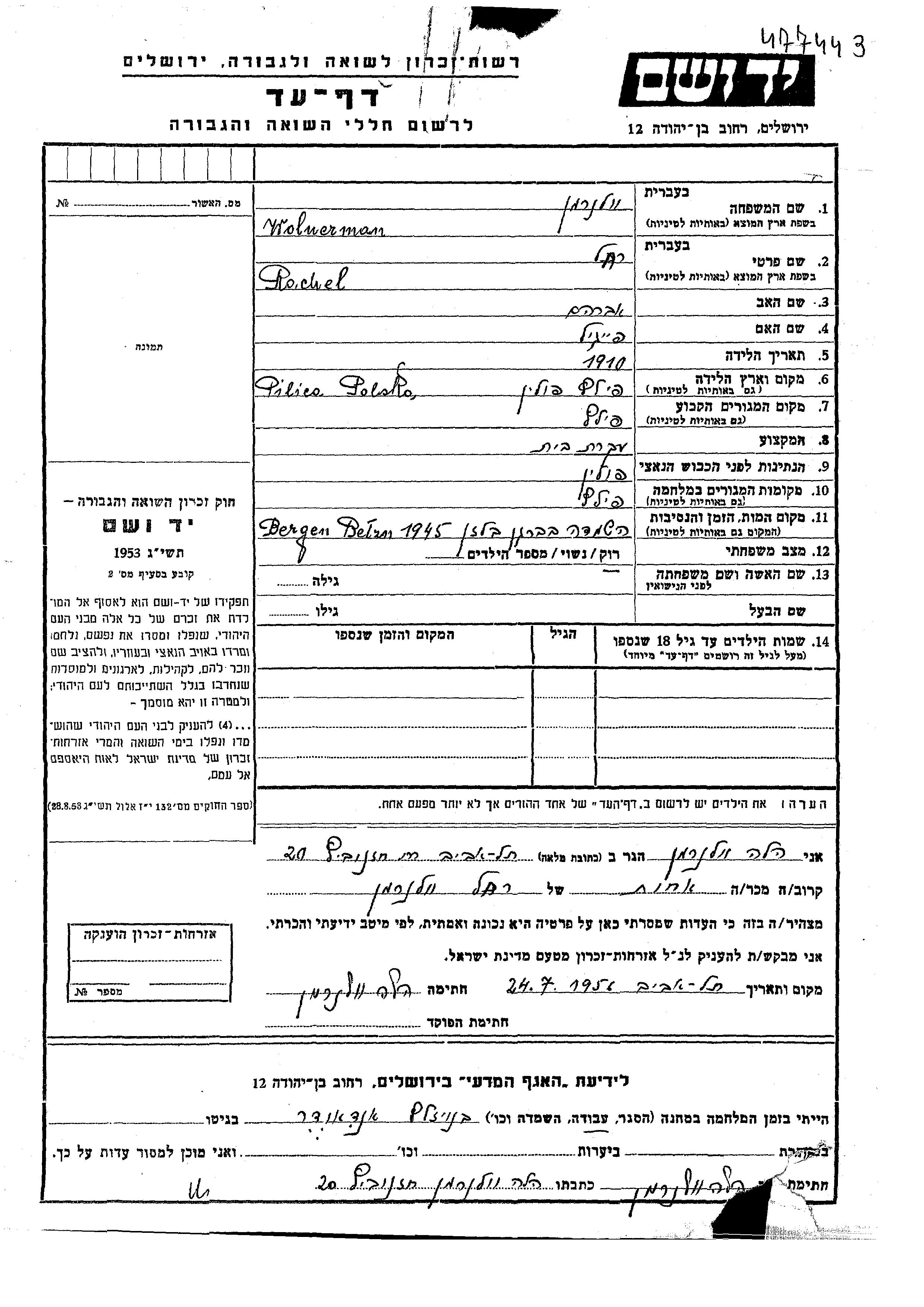 Rachel Wolnerman wurde im Jahr 1910 in Pilica, Polen geboren. Sie war die Tochter von Avraham und Feigel. Sie war Hausfrau und Ledig. Vor dem Zweiten Weltkrieg lebte sie in Pilica, Polen. Während des Krieges war sie in Pilica, Polen.