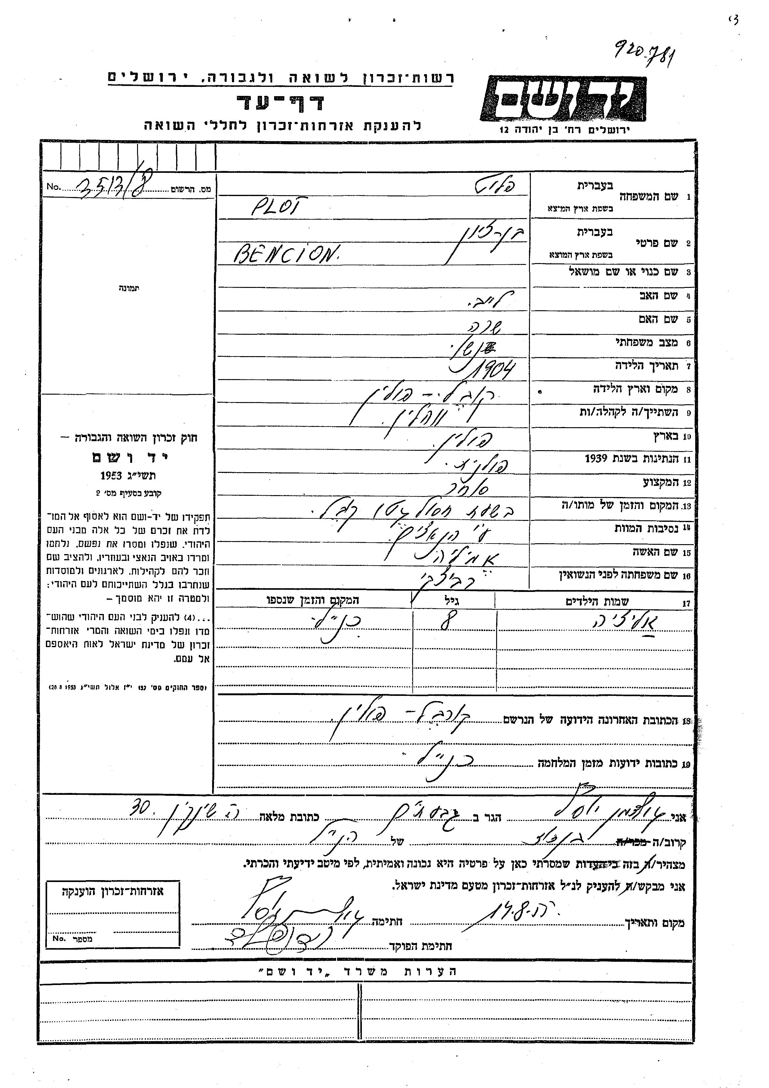 Alitzia Plot wurde Sie war die Tochter von Bencion und Emilia, geb. Rabitzki. Sie war Kind. Vor dem Zweiten Weltkrieg lebte sie in Wolyn, Polen. Während des Krieges war sie in Kowel, Polen.