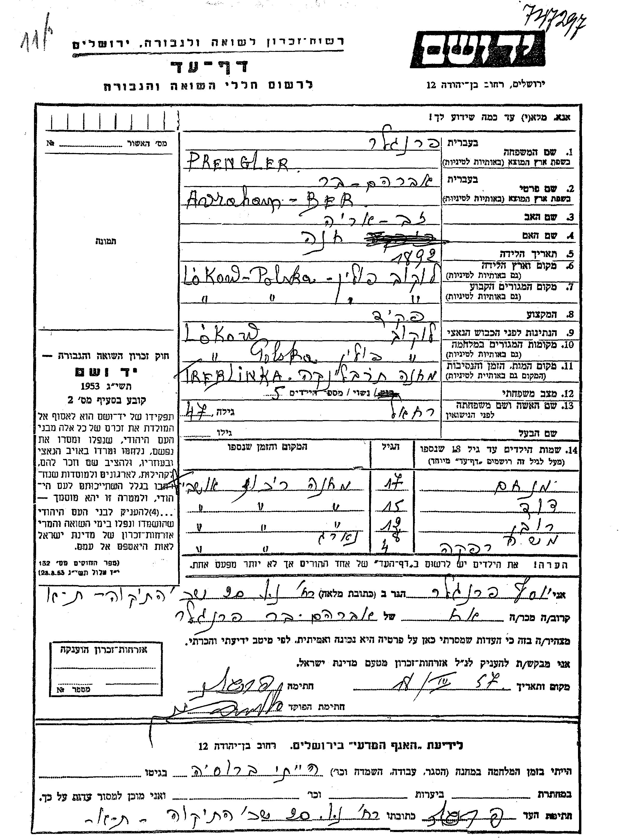 Ruven Prengler wurde Er war der Sohn von Avraham Ber und Rakhel. Er war Kind. Vor dem Zweiten Weltkrieg lebte er in Lukow, Polen. Während des Krieges war er in Lukow, Polen.