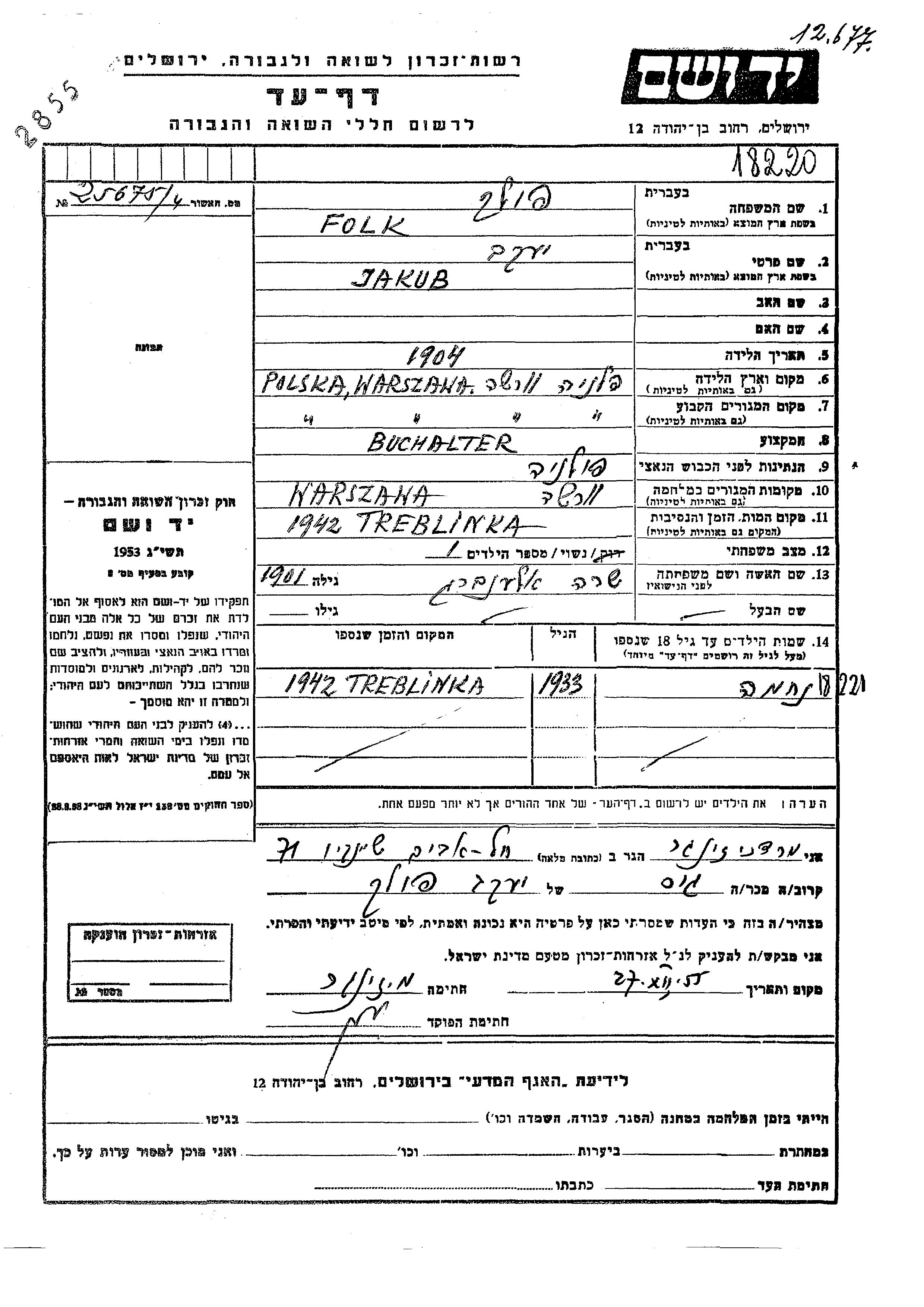 Nekhama Folk Polak wurde im Jahr 1933 geboren. Er/sie war der/ die Sohn/Tochter von Jakub und Sara, geb. Alenberg. Er/Sie war Kind. Vor dem Zweiten Weltkrieg er/sie in Warszawa, Polen. Während des Krieges war er/sie in Warszawa, Polen.