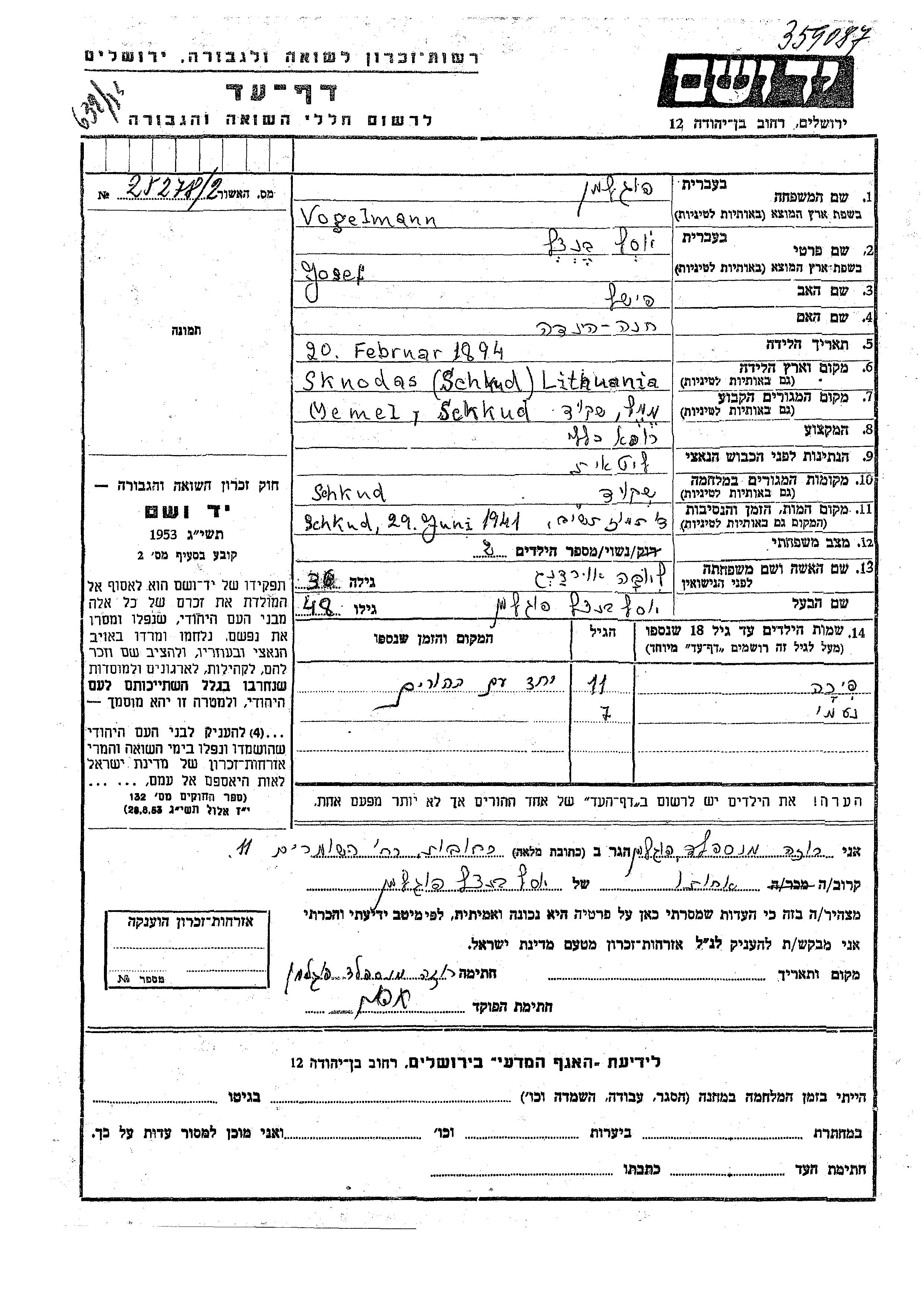 Ester Vogelman wurde Sie war die Tochter von Josef Bentzion und Liuba, geb. Urdang. Sie war Kind. Vor dem Zweiten Weltkrieg lebte sie in Memel, Litauen. Während des Krieges war sie in Skuodas, Litauen.