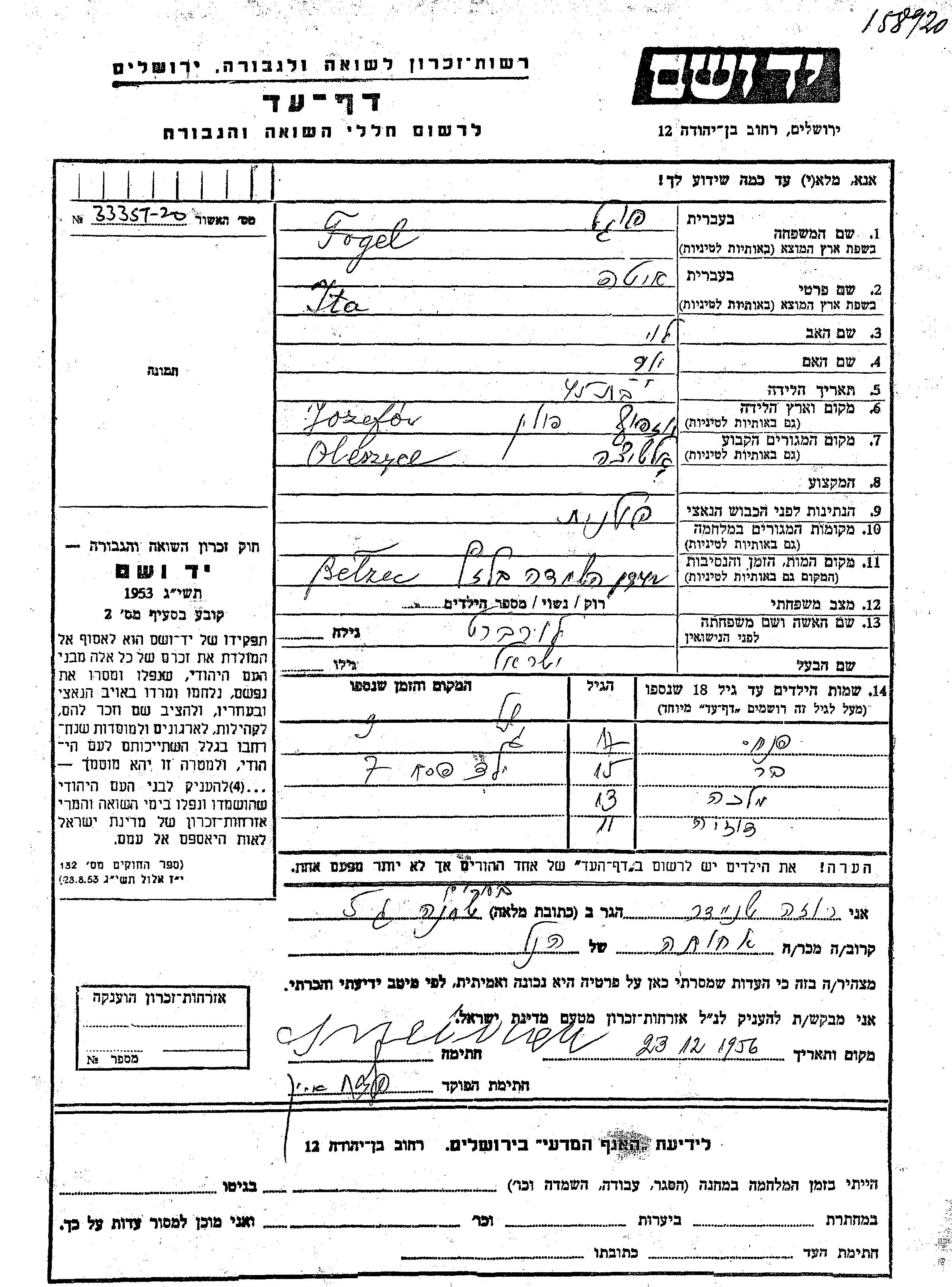 Vorname unbekannt Fogel wurde Er/sie war der/ die Sohn/Tochter von Yisrael und Ita, geb. Lorbert. Er/Sie war Kind. Vor dem Zweiten Weltkrieg er/sie in Oleszyce, Polen.
