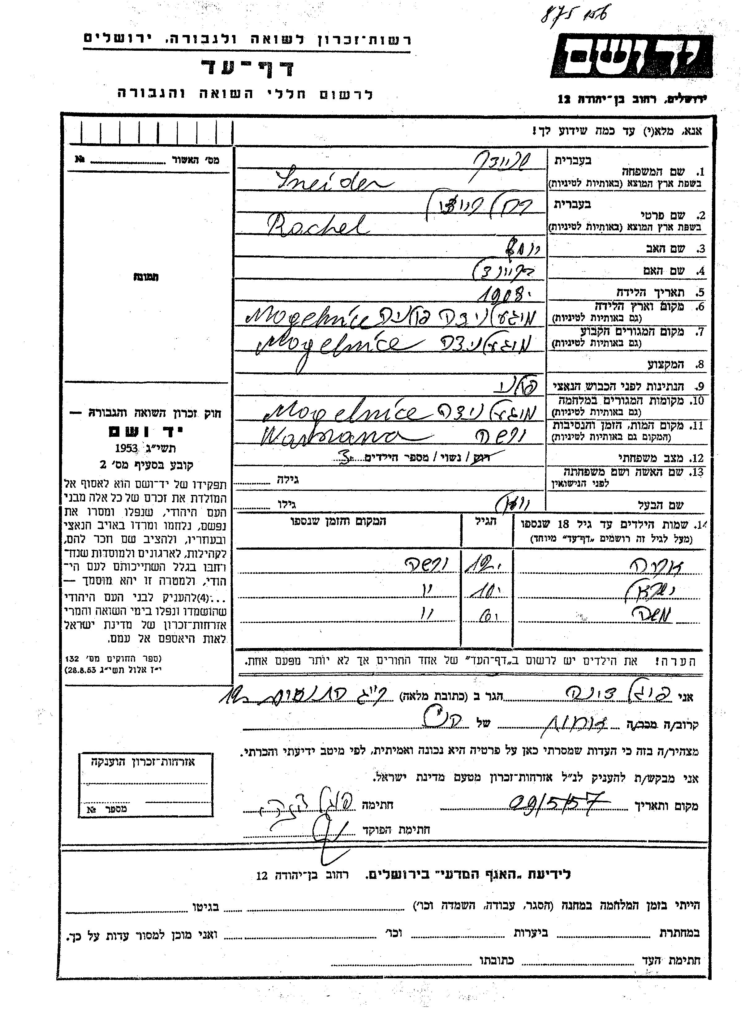 Yisrael Sneider wurde Er war der Sohn von Yoel und Rachel Reizil. Er war Kind. Vor dem Zweiten Weltkrieg lebte er in Mogelnice, Polen. Während des Krieges war er in Mogelnice, Polen.