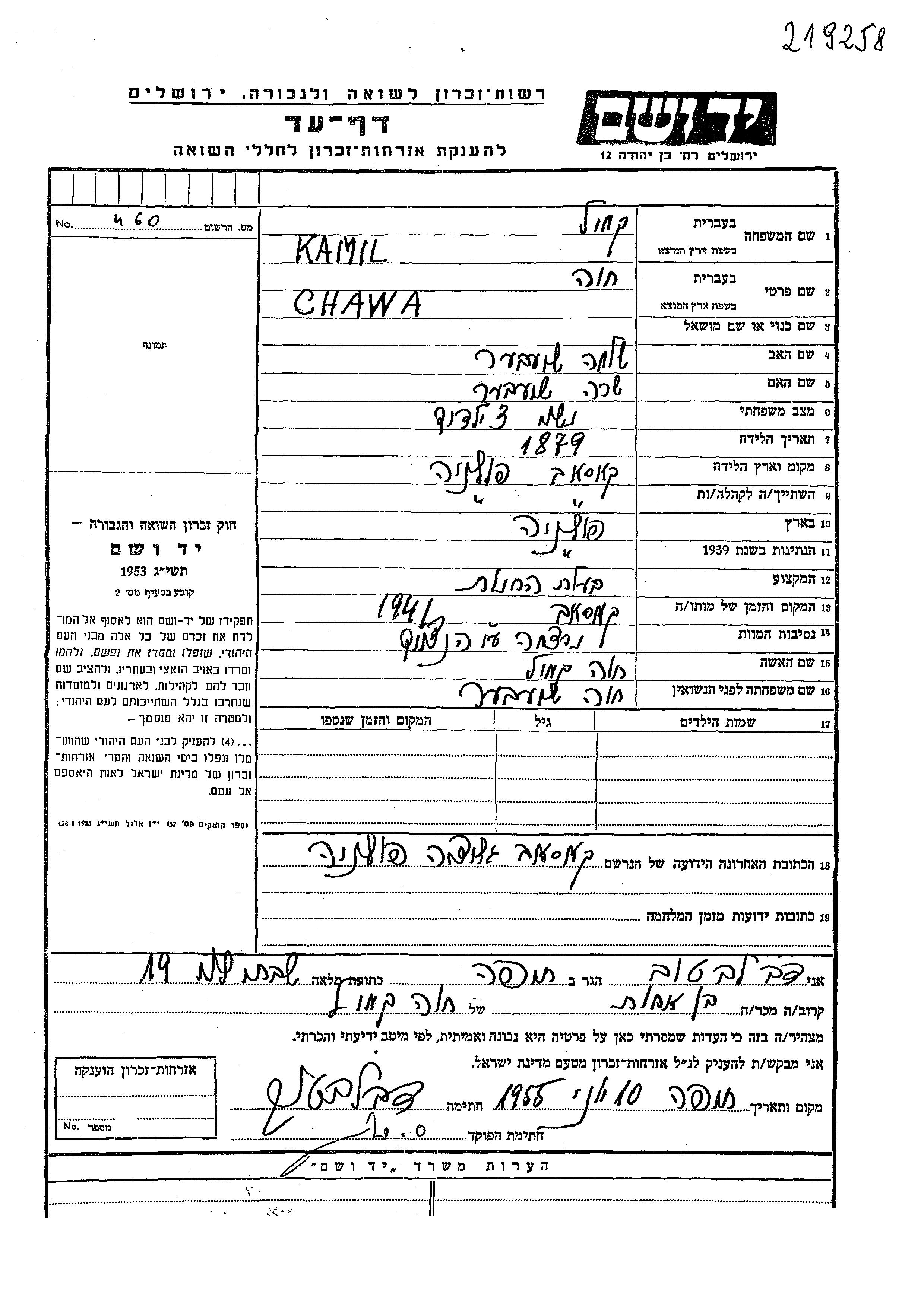 Chawa Kamil, geb. Shuber wurde im Jahr 1879 in Kosow, Polen geboren. Sie war die Tochter von Shlomo und Sara. Sie war Ladenbesitzer/-in. Vor dem Zweiten Weltkrieg lebte sie in Kosow, Polen. Während des Krieges war sie in Kosow, Polen.