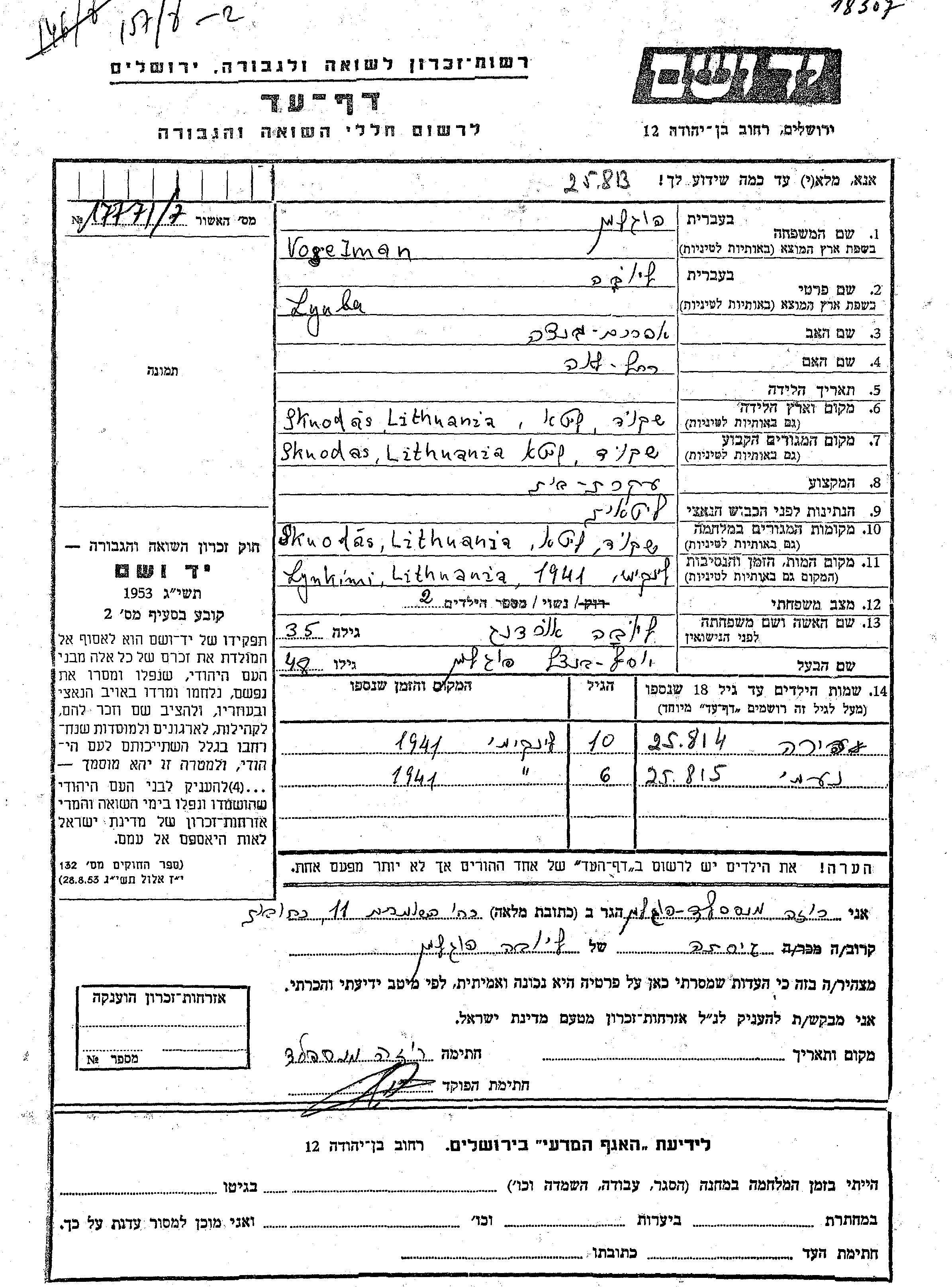 Vogelman Naomi Skuodas, Litauen Gedenkblatt