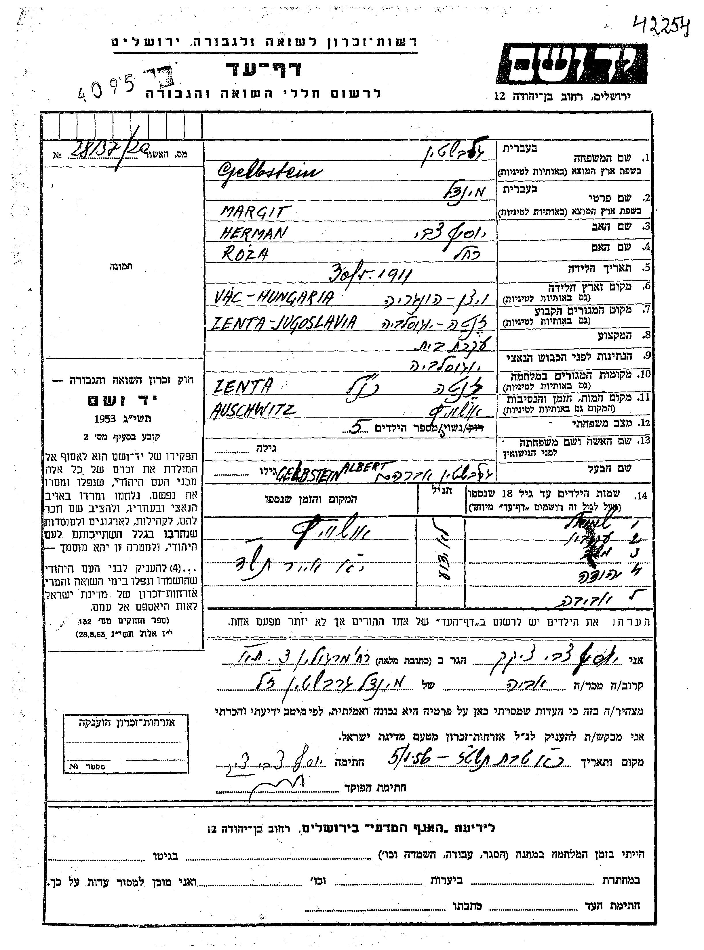 Shmuel Gelbstein wurde Er war der Sohn von Albert Avraham und Margit Mindl. Er war Kind. Vor dem Zweiten Weltkrieg lebte er in Zenta, Jugoslawien. Während des Krieges war er in Zenta, Jugoslawien.