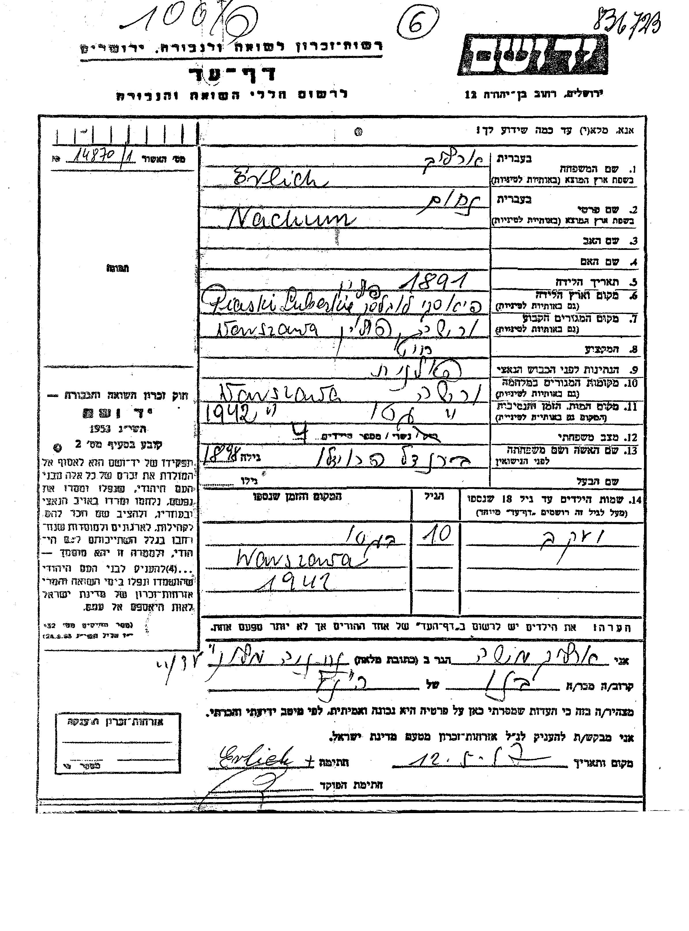 Yaakov Erlich wurde Er war der Sohn von Nachum und Brandel, geb. Pravidlo. Er war Kind. Vor dem Zweiten Weltkrieg lebte er in Warszawa, Polen. Während des Krieges war er in Warszawa, Polen.