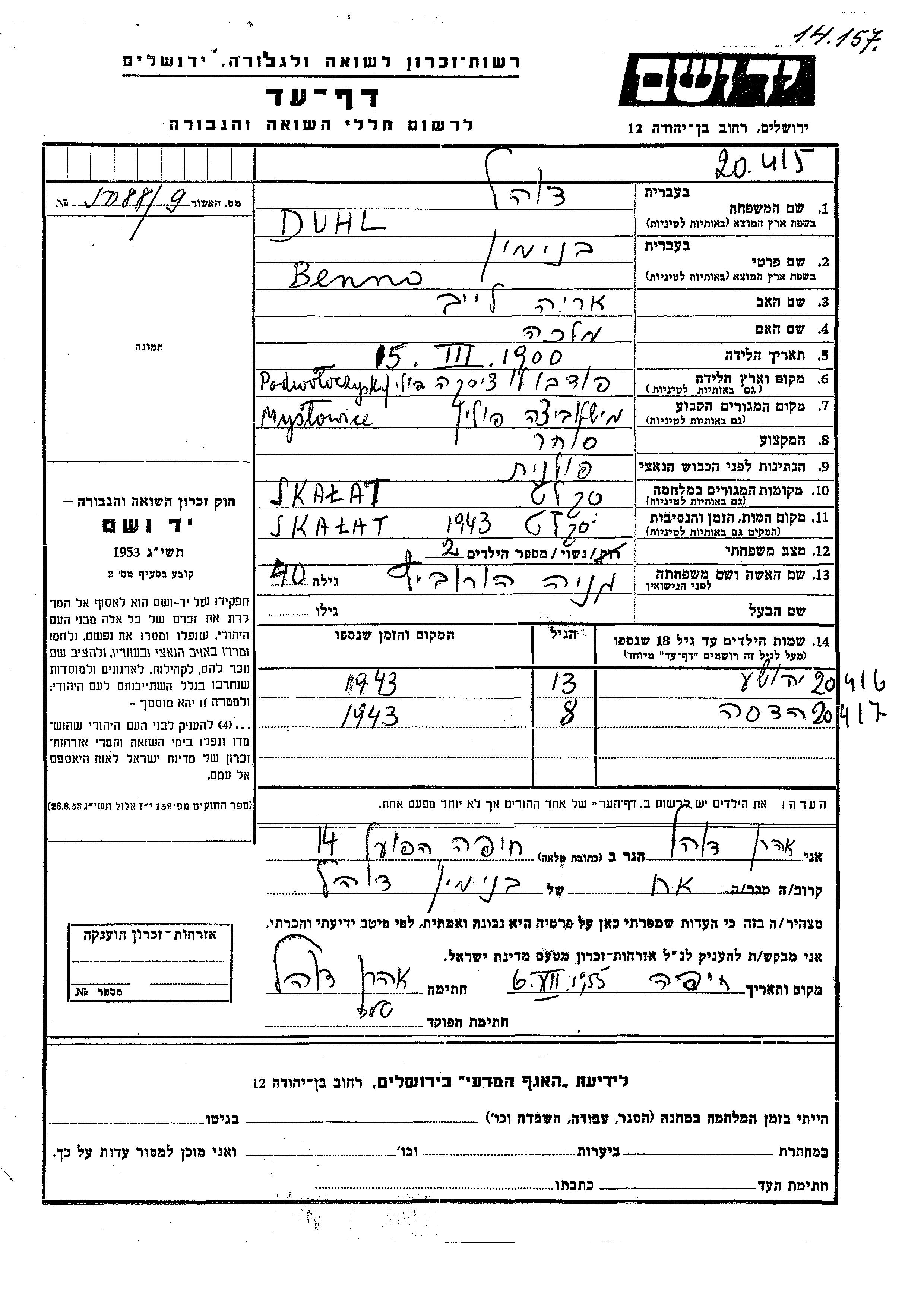 Hadasa Duhl wurde Sie war die Tochter von Benno und Mania, geb. Horovitz. Sie war Kind. Vor dem Zweiten Weltkrieg lebte sie in Myslowice, Polen. Während des Krieges war sie in Skalat, Polen.