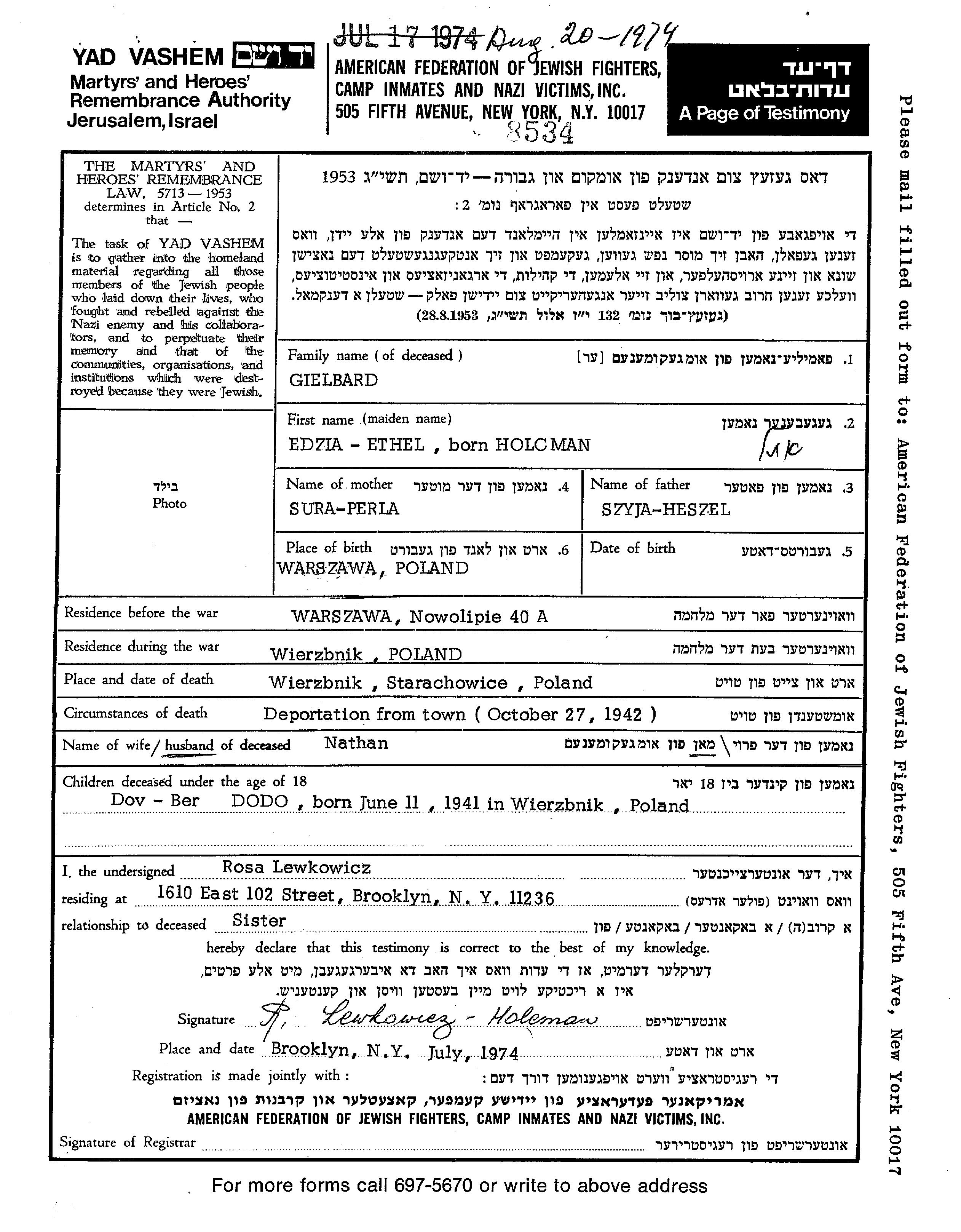 Dov Ber Gielbard wurde im Jahr 1941 geboren. Er war der Sohn von Nathan und Ethel Edzia, geb. Holcman. Er war Kind. Vor dem Zweiten Weltkrieg lebte er in Warszawa, Polen. Während des Krieges war er in Wierzbnik, Polen.