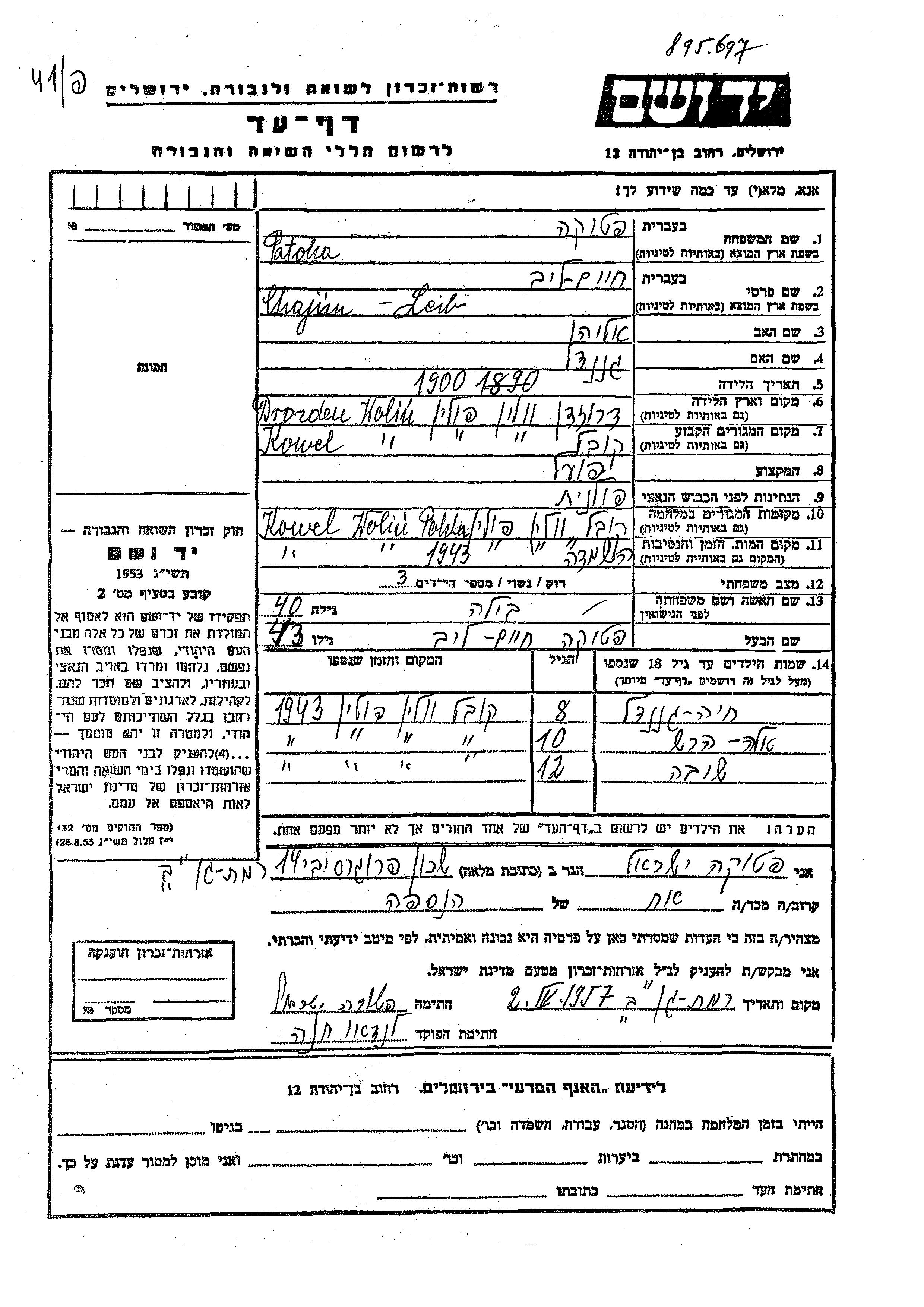 Patoka Batsheva Kowel, Polen Gedenkblatt