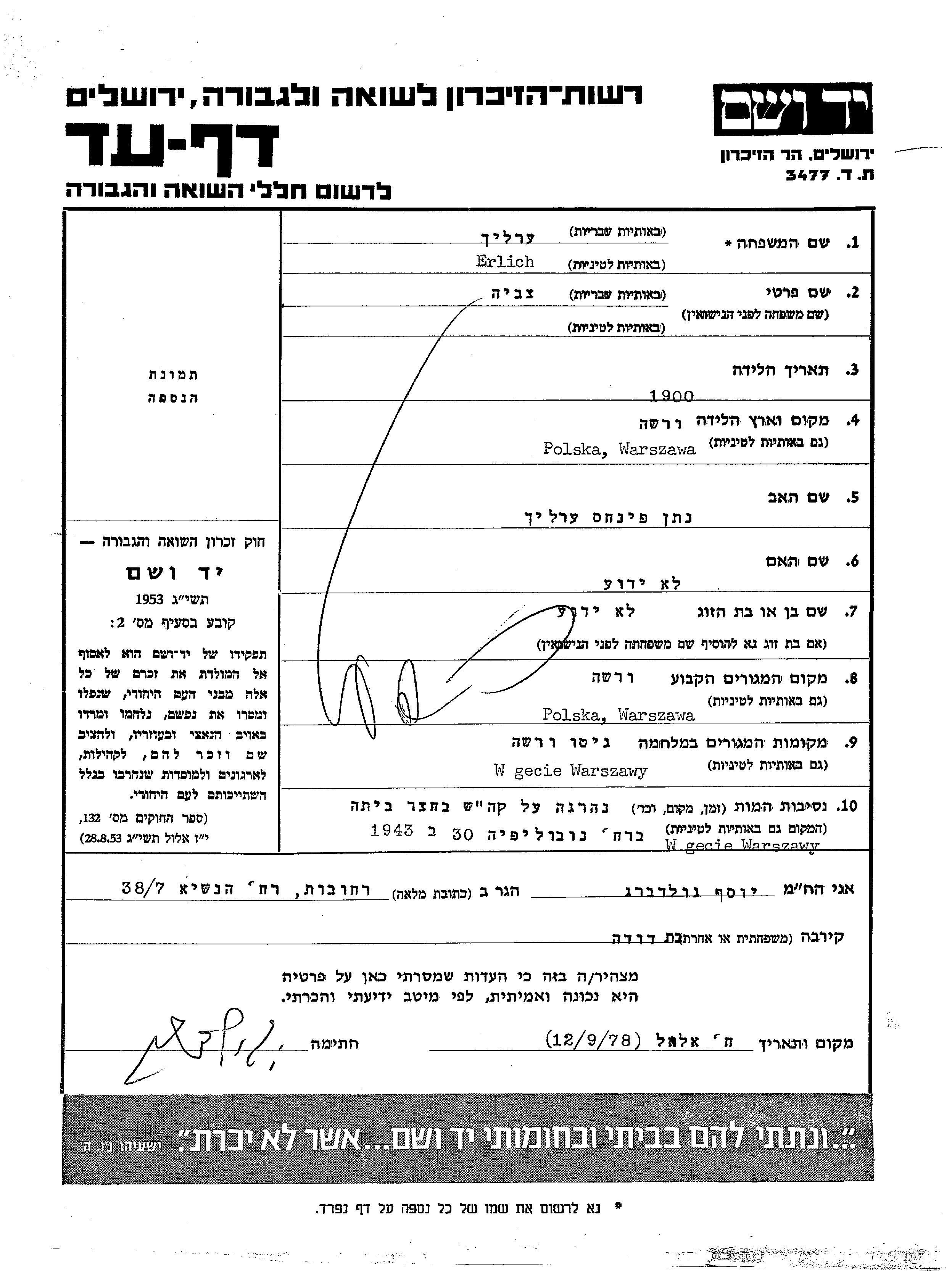 Tzvia Erlich wurde im Jahr 1900 in Warszawa, Polen geboren. Sie war die Tochter von Natan Pinkhas. Vor dem Zweiten Weltkrieg lebte sie in Warszawa, Polen. Während des Krieges war sie in Warszawa, Polen.