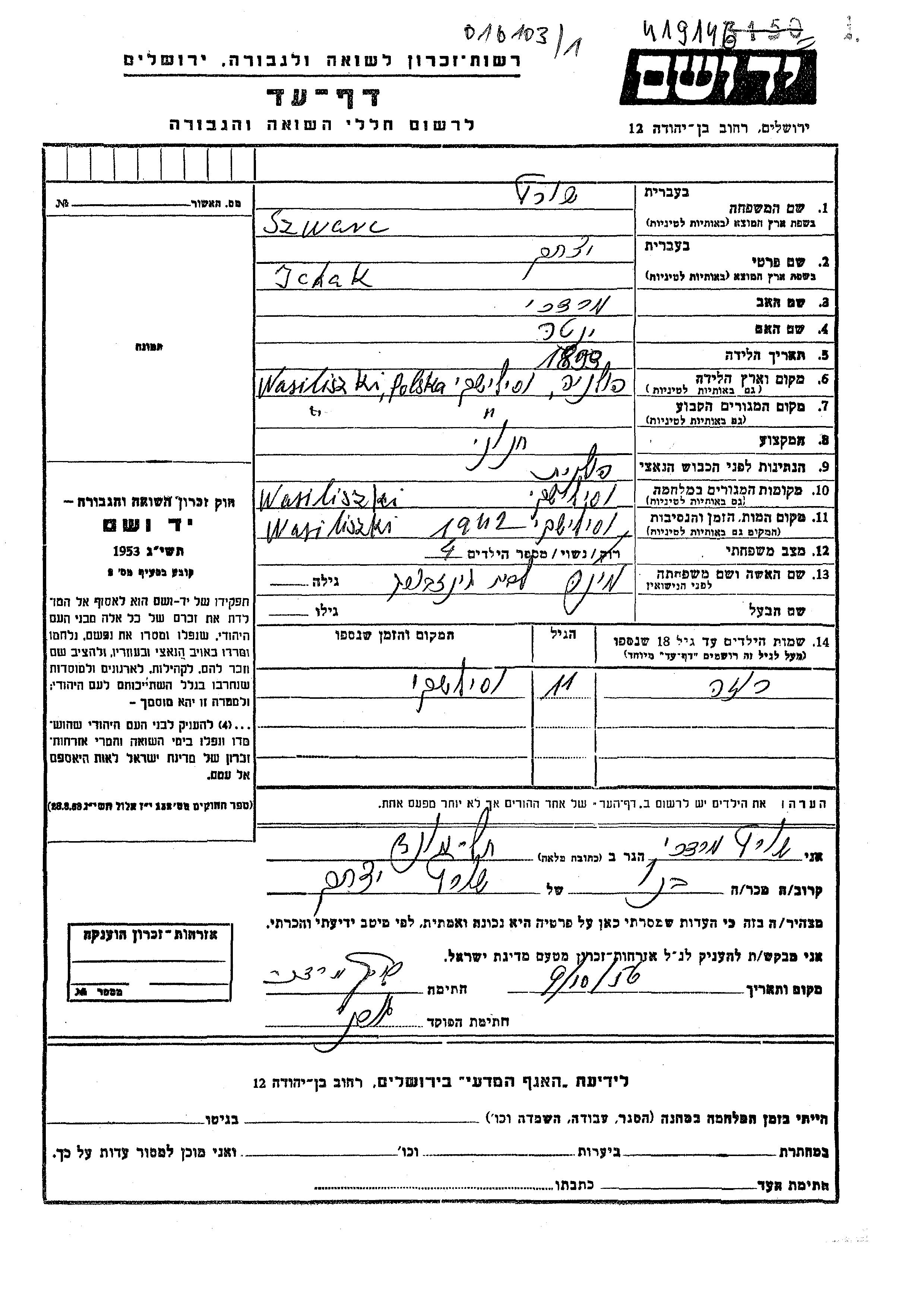 Roza Szwarc wurde Er/sie war der/ die Sohn/Tochter von Jchak und Mina, geb. Gintzburg. Er/Sie war Kind. Vor dem Zweiten Weltkrieg er/sie in Wasiliszki, Polen. Während des Krieges war er/sie in Wasiliszki, Polen.