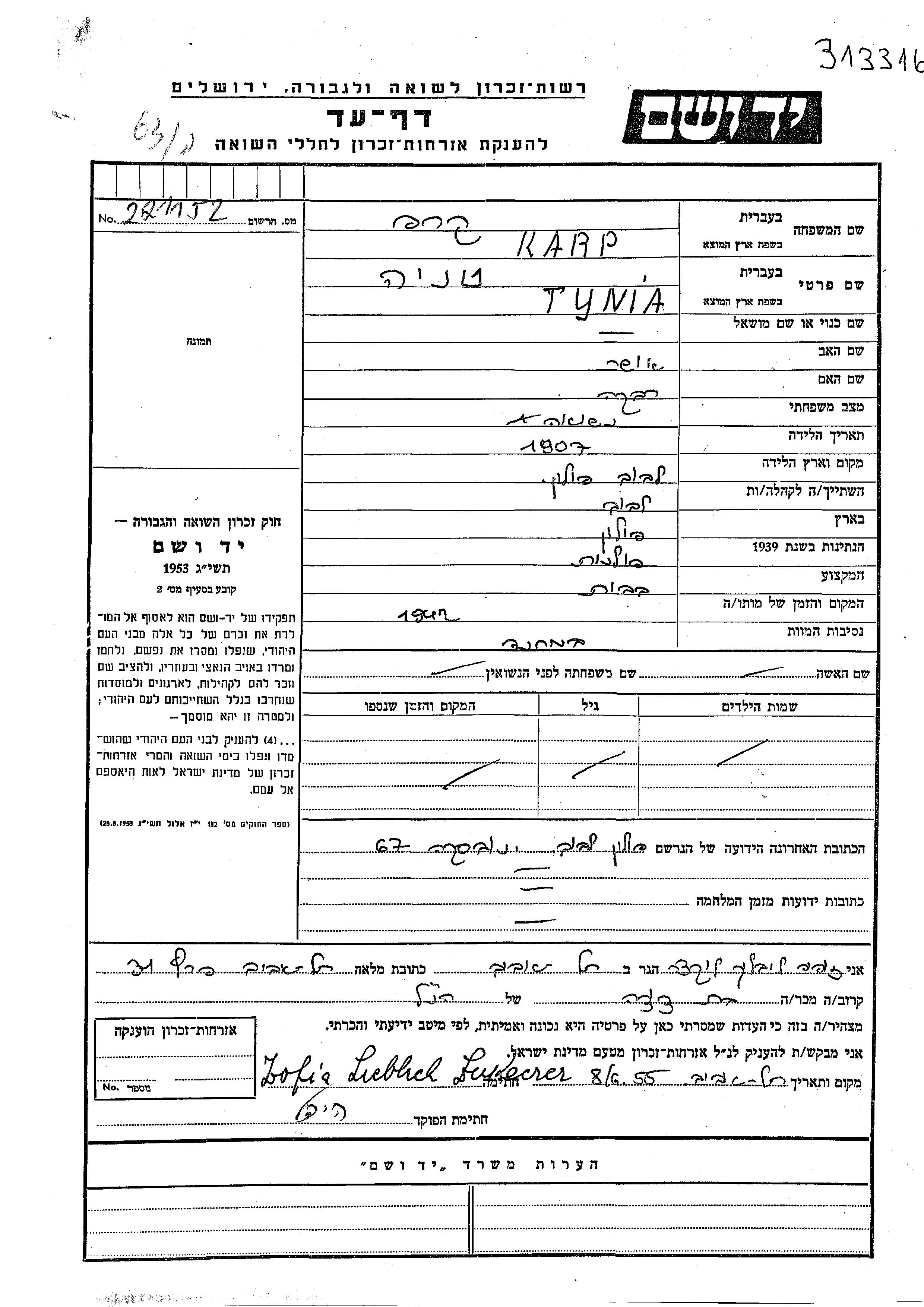 Tynia Tatiana Karp wurde im Jahr 1907 in Lwow, Polen geboren. Sie war die Tochter von Usher und Rivka. Sie war Hausfrau. Vor dem Zweiten Weltkrieg lebte sie in Lwow, Polen. Während des Krieges war sie in Lwow, Polen.