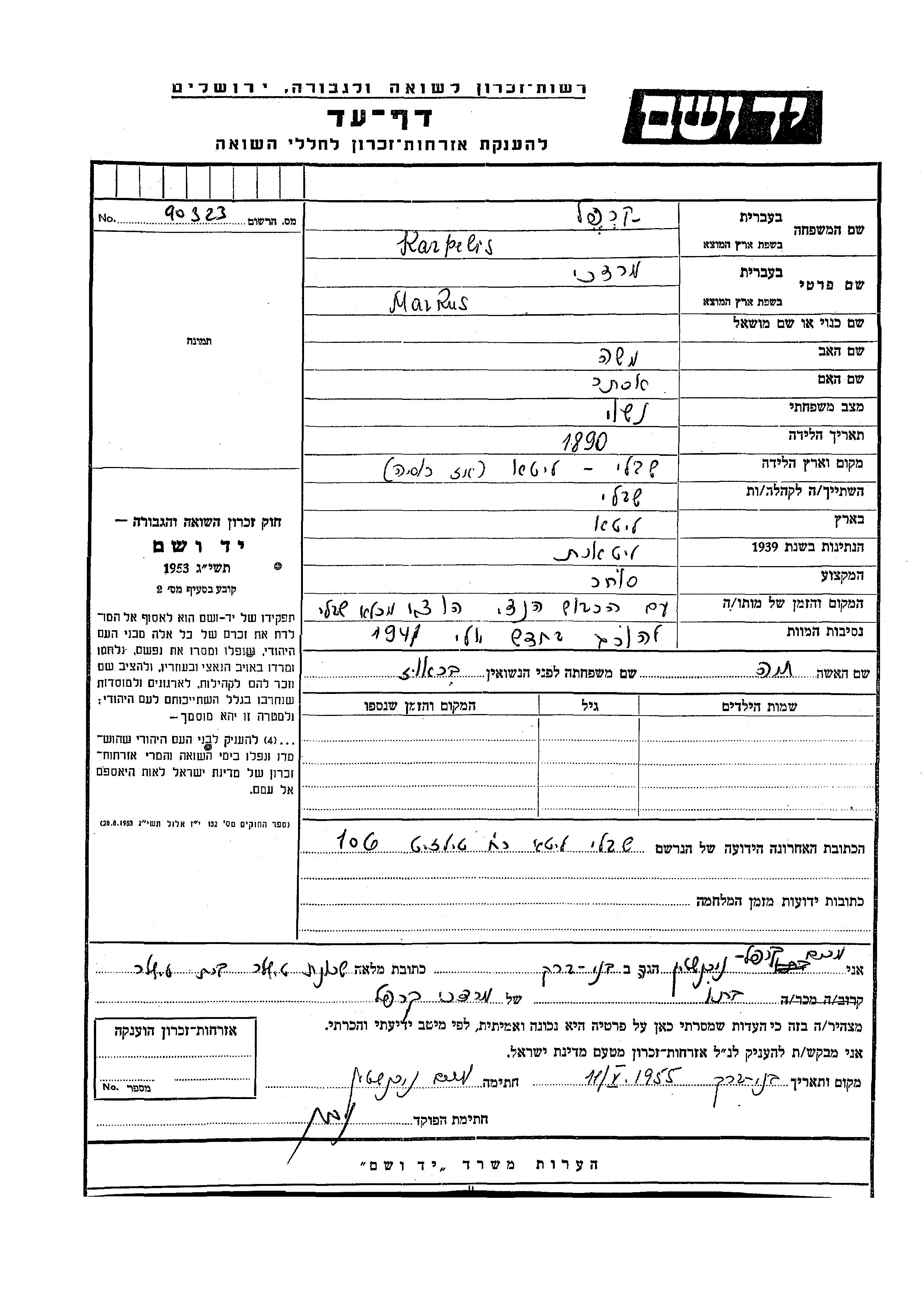 Mordekhai Markus Karpelis wurde im Jahr 1890 in Szabla, Litauen geboren. Er war der Sohn von Moshe und Ester. Er war Kaufmann/-frau und mit Khaia, geb. Brauz Verheiratet. Vor dem Zweiten Weltkrieg lebte er in Szabla, Litauen. Während des Krieges war er in Szabla, Litauen.