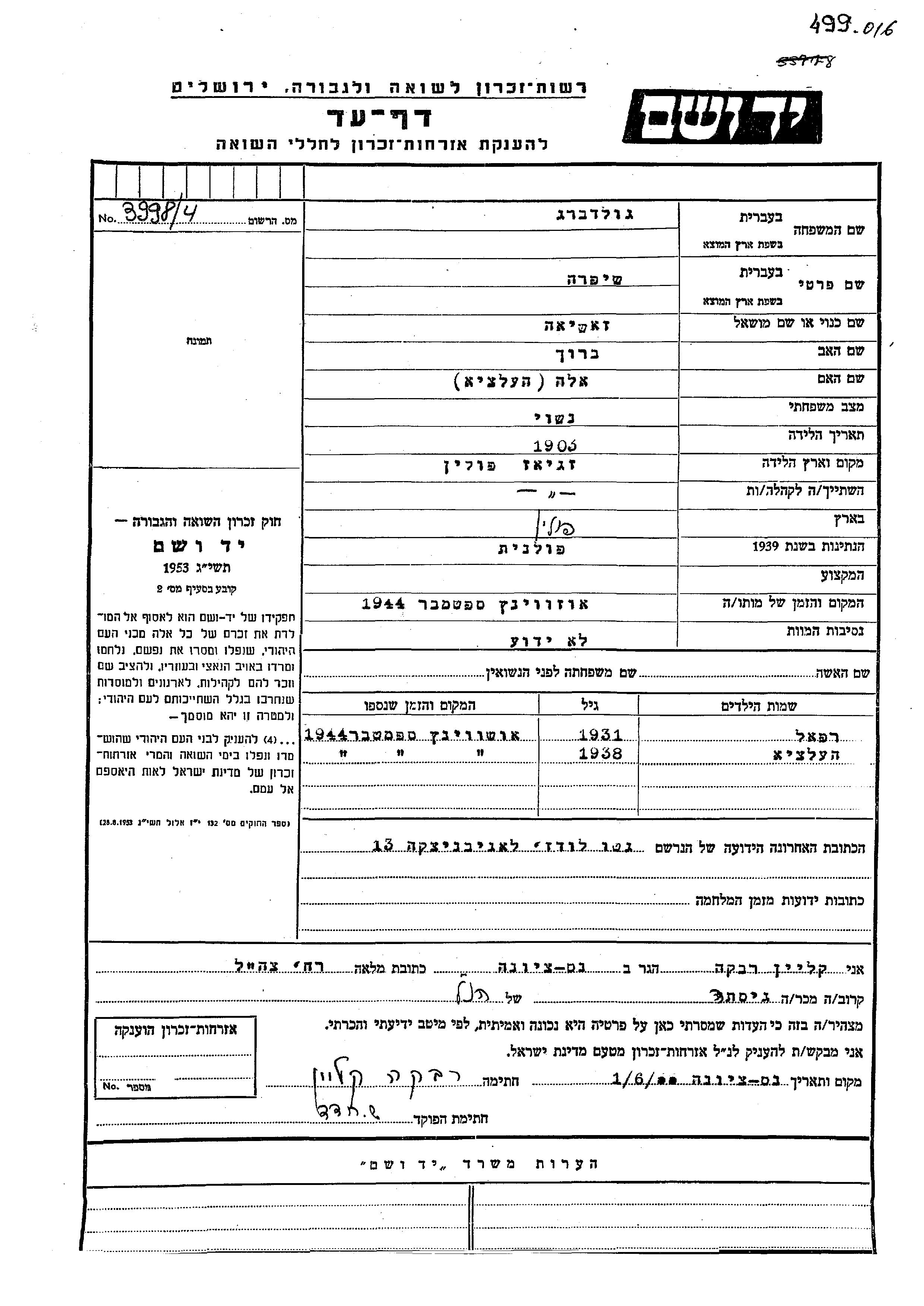 Heltzya Goldberg wurde im Jahr 1938 geboren. Sie war die Tochter von Shifra. Sie war Kind. Vor dem Zweiten Weltkrieg lebte sie in Zgierz, Polen. Während des Krieges war sie in Lodz, Polen.