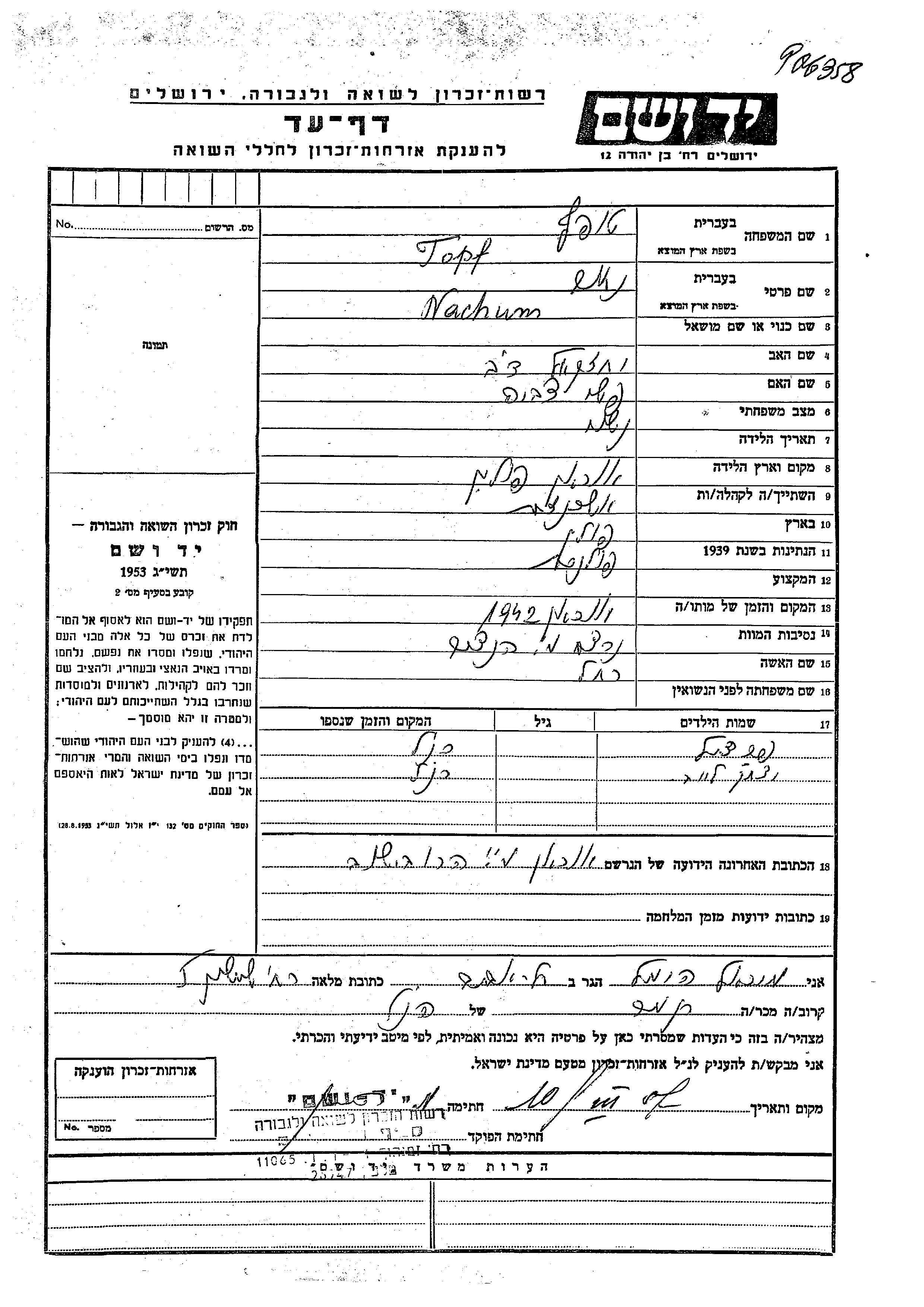 Yitzkhak Leib Topf wurde Er war der Sohn von Nakhum und Rakhel. Er war Kind. Vor dem Zweiten Weltkrieg lebte er in Polen. Während des Krieges war er in Uchan, Polen.