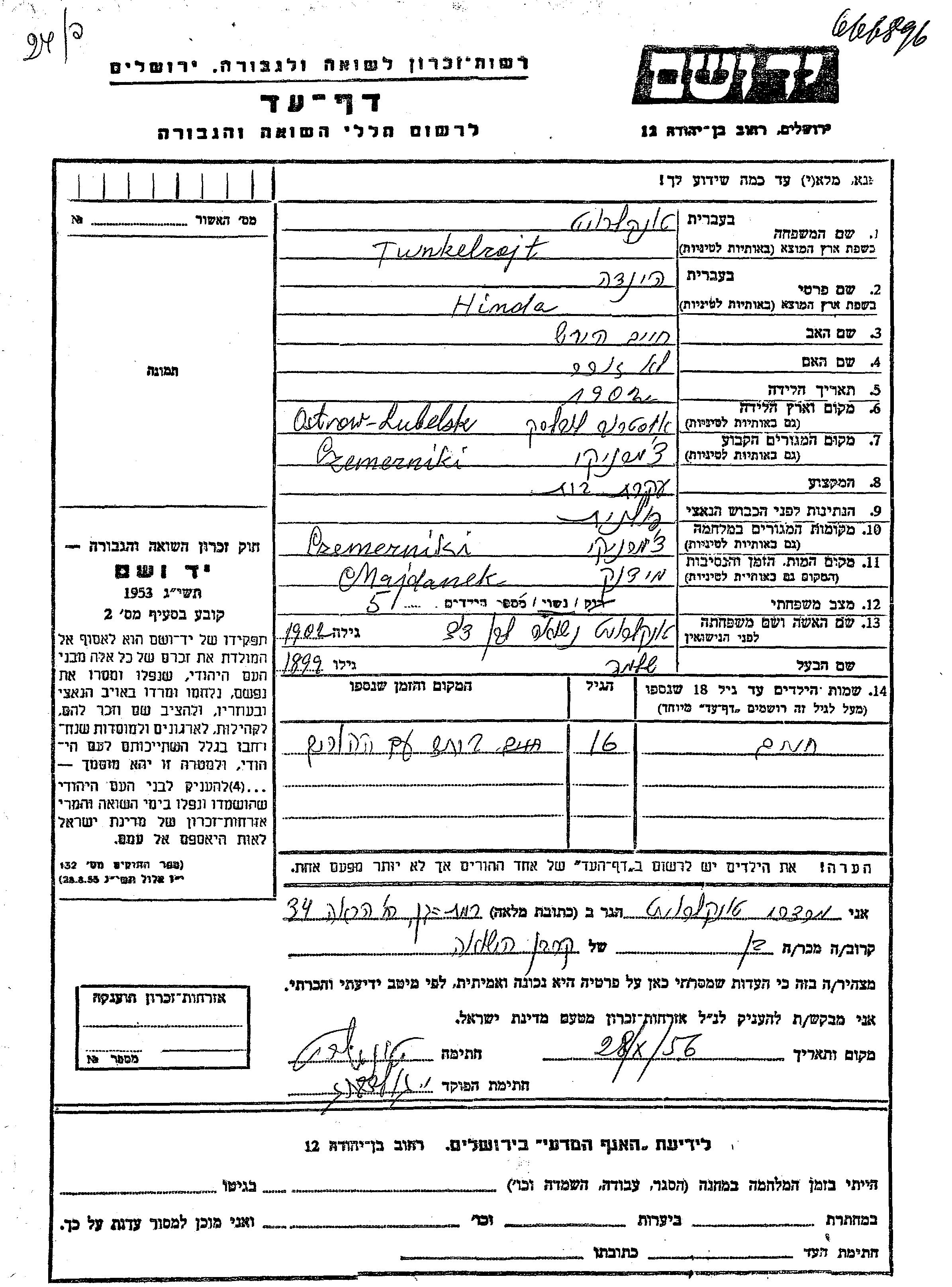 Khaim Tunkielrojt wurde Er war der Sohn von Szlomo und Hinda. Er war Kind. Vor dem Zweiten Weltkrieg lebte er in Czemernik, Polen. Während des Krieges war er in Czemernik, Polen.