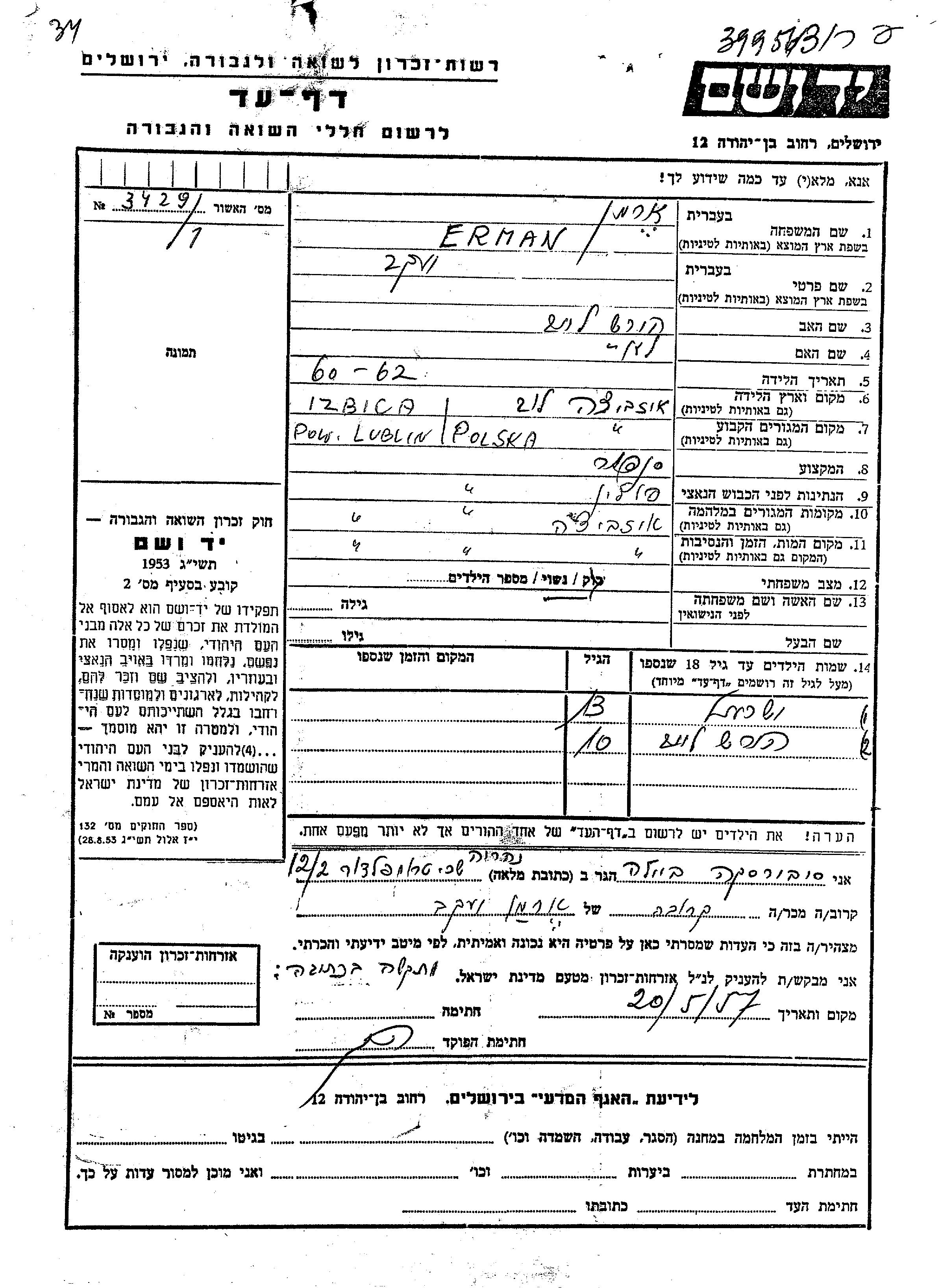Yisrael Erman wurde Er war der Sohn von Yaakov. Er war Kind. Vor dem Zweiten Weltkrieg lebte er in Lublin, Polen. Während des Krieges war er in Izbica Lubelski, Polen.
