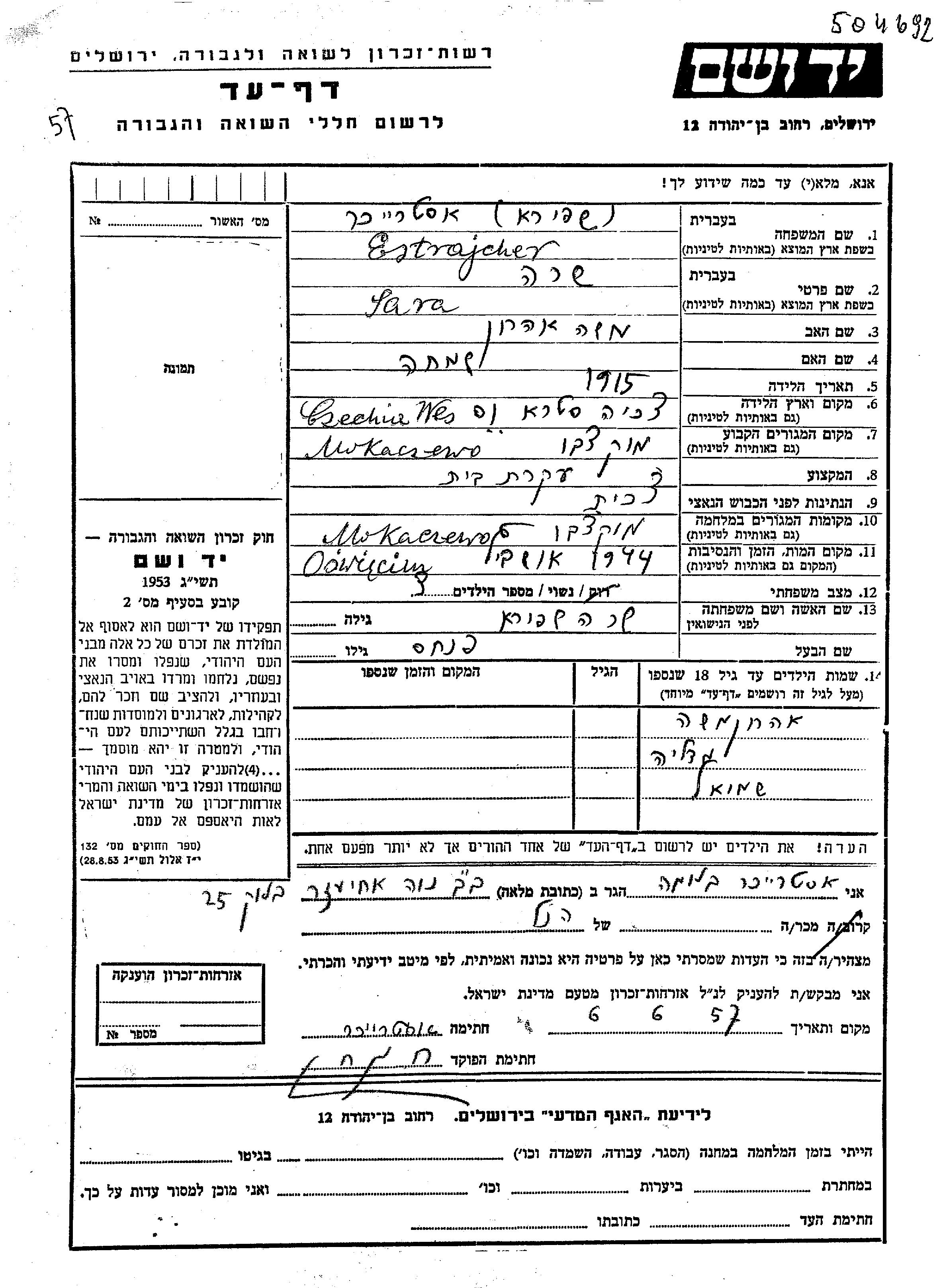 Shmuel Estrajcher wurde Er war der Sohn von Pinkhas und Sara, geb. Shapira. Er war Kind. Vor dem Zweiten Weltkrieg lebte er in Mukaczewo, Tschechoslowakei. Während des Krieges war er in Mukaczewo, Tschechoslowakei.
