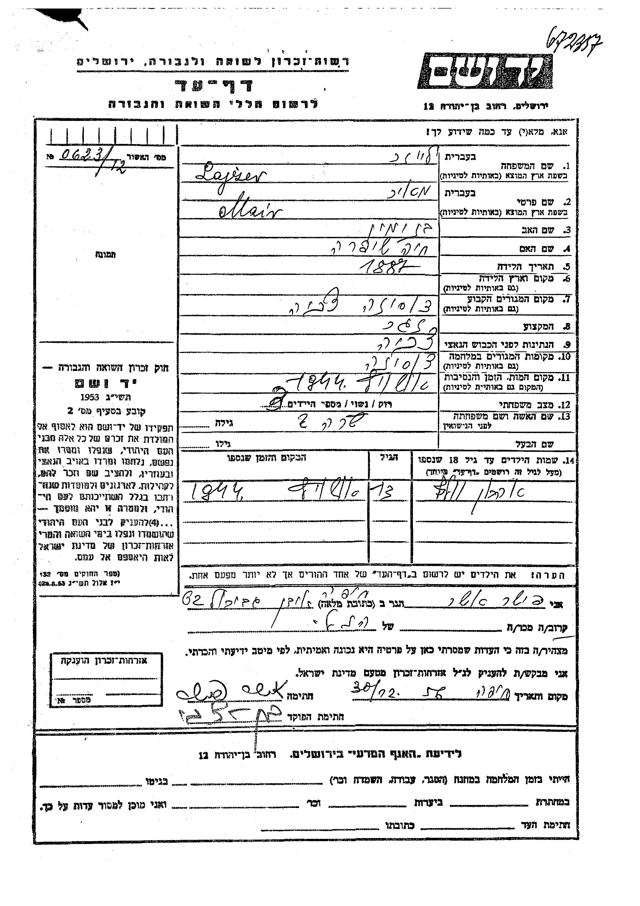 Aharon Volf Lajzer wurde Er war der Sohn von Mair und Sara. Er war Kind. Vor dem Zweiten Weltkrieg lebte er in Dusina, Tschechoslowakei. Während des Krieges war er in Dusina, Tschechoslowakei.