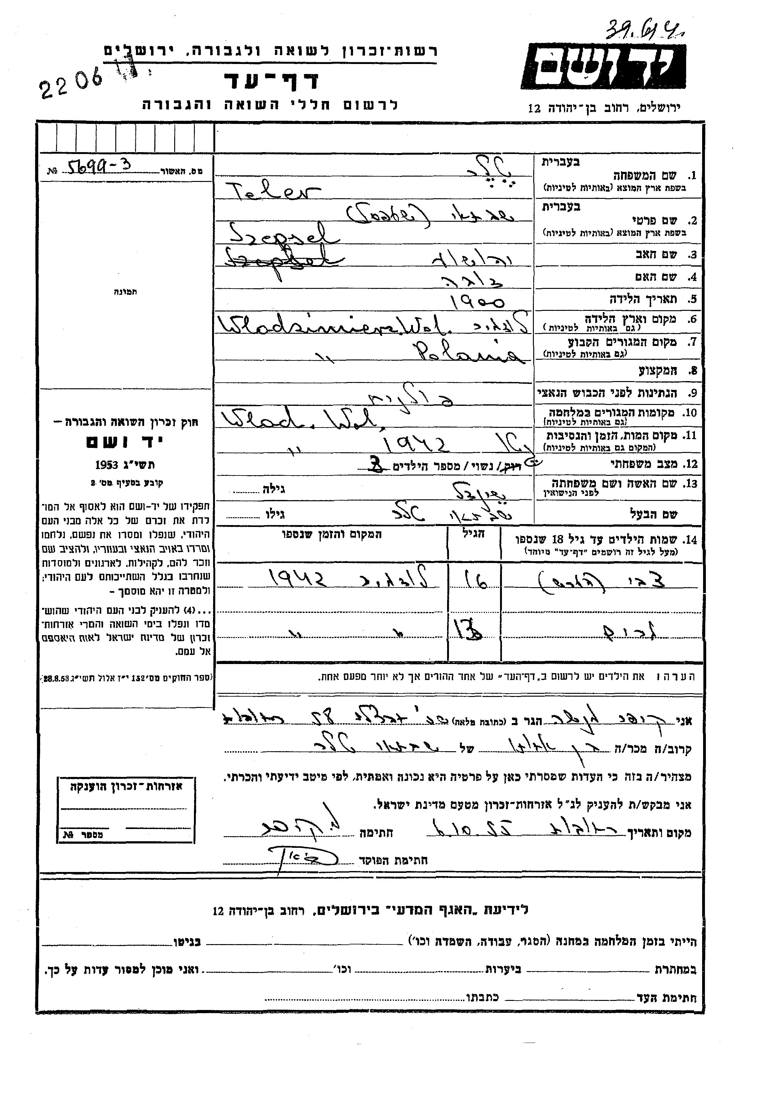 Miriam Teler Taler wurde Sie war die Tochter von Szepsel und Sheindl. Sie war Kind. Vor dem Zweiten Weltkrieg lebte sie in Wlodzimierz Wolynski, Polen. Während des Krieges war sie in Wlodzimierz Wolynski, Polen.