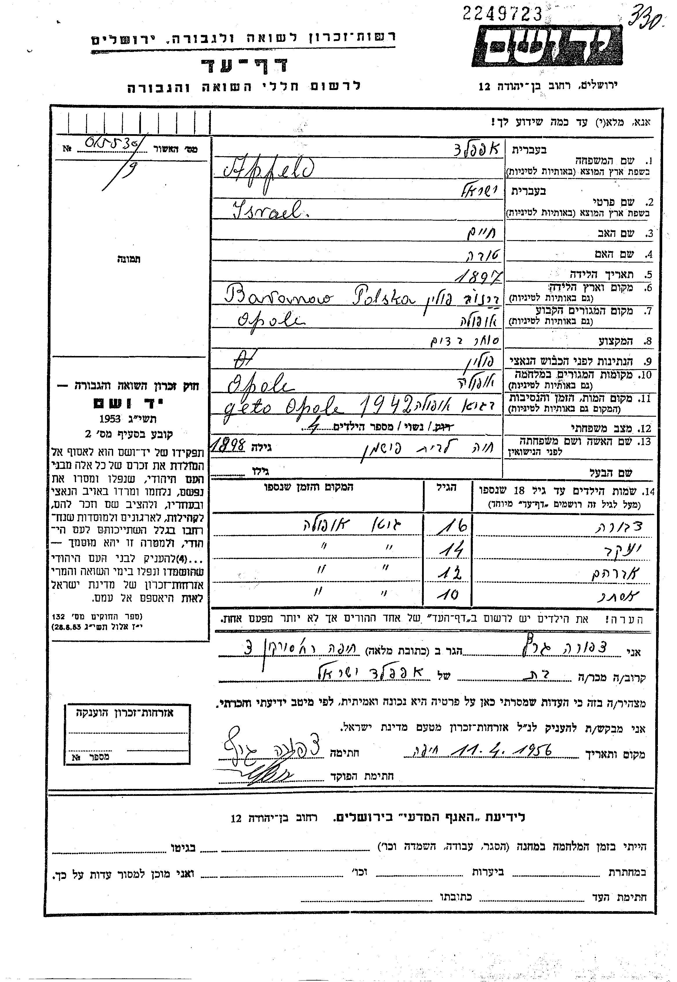 Yaakov Apfeld wurde Er war der Sohn von Israel und Chaja. Er war Kind. Vor dem Zweiten Weltkrieg lebte er in Opole Lubelski, Polen. Während des Krieges war er in Opole Lubelski, Polen.