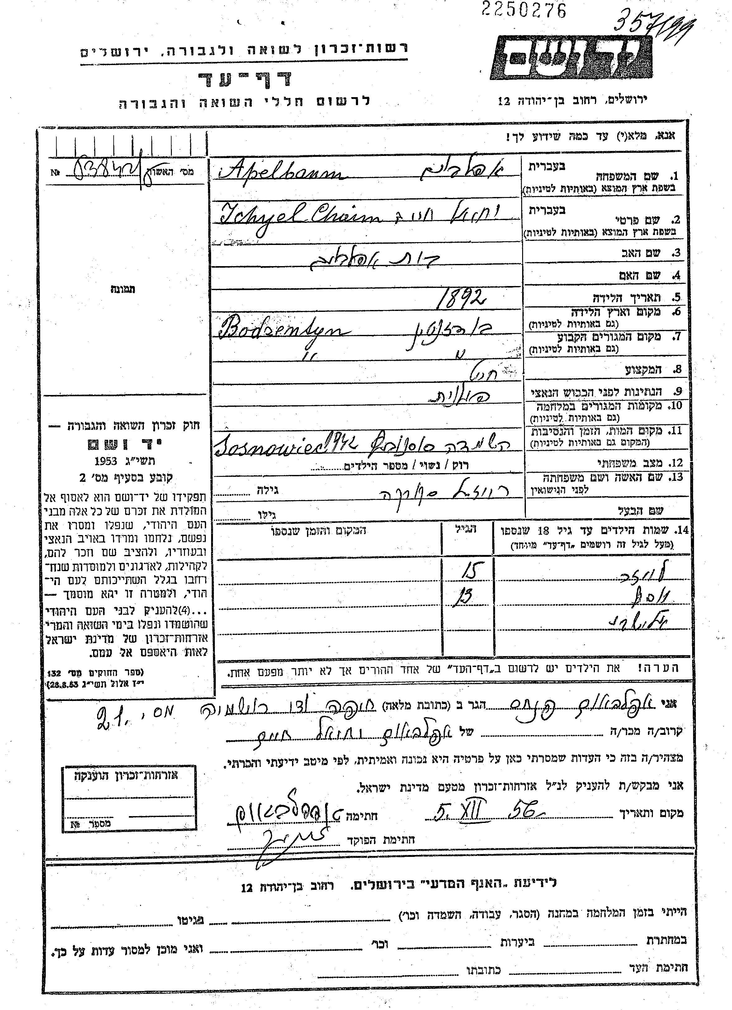 Elisheva Apelbaum wurde Sie war die Tochter von Ichyel Chaim und Rajsel. Sie war Kind. Vor dem Zweiten Weltkrieg lebte sie in Bodzentyn, Polen. Während des Krieges war sie in Polen.