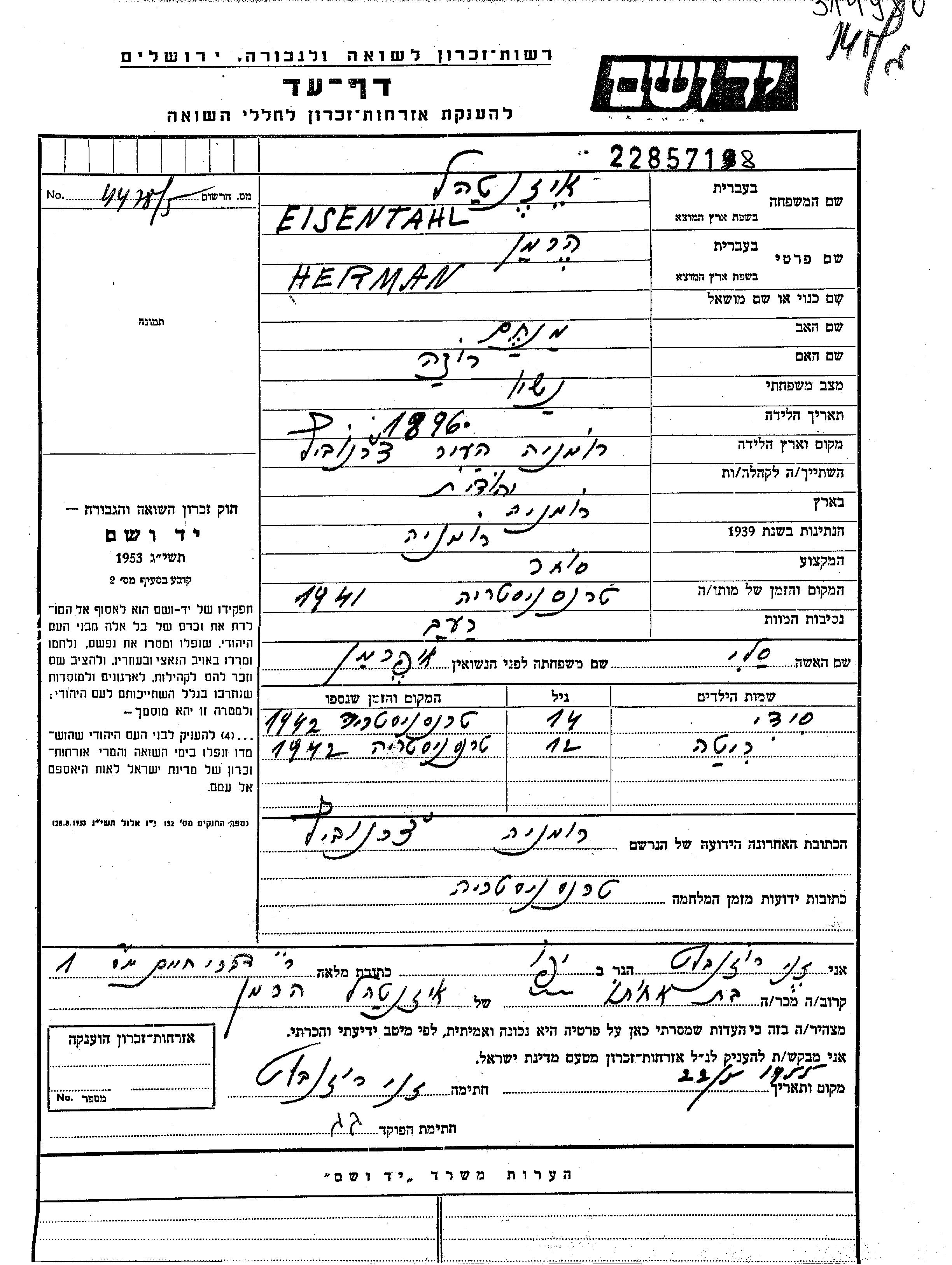 Rita Eisenthal wurde Sie war die Tochter von Herman und Sali, geb. Eiferman. Sie war Kind. Vor dem Zweiten Weltkrieg lebte sie in Czernowitz, Rumänien. Während des Krieges war sie in Transnistria, Ukraine (UdSSR).