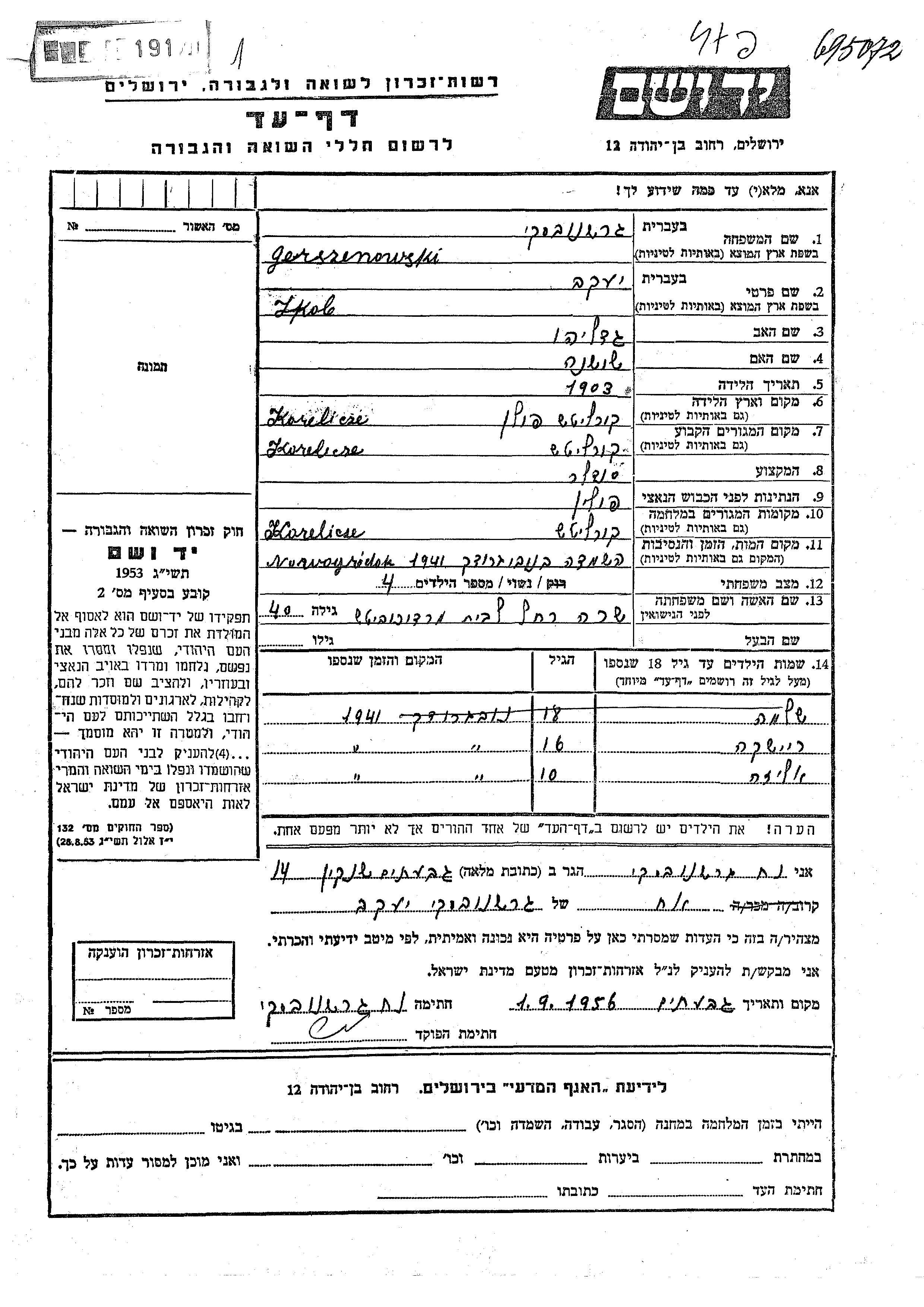 Gerszenowski Shlomo Korelicze, Polen Gedenkblatt